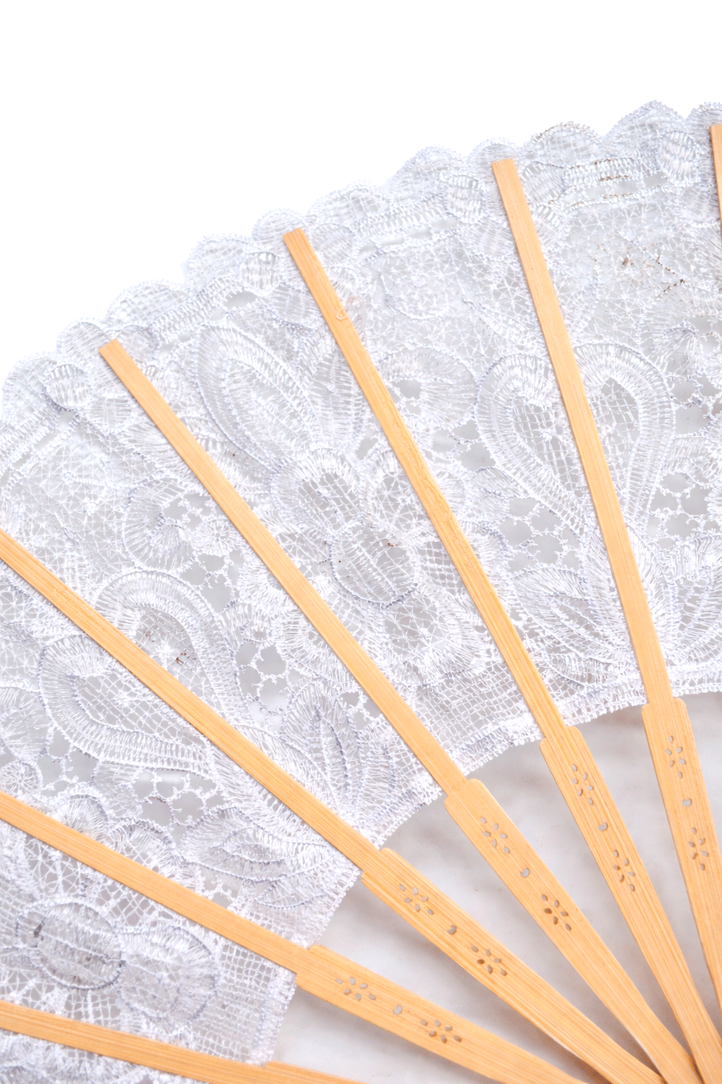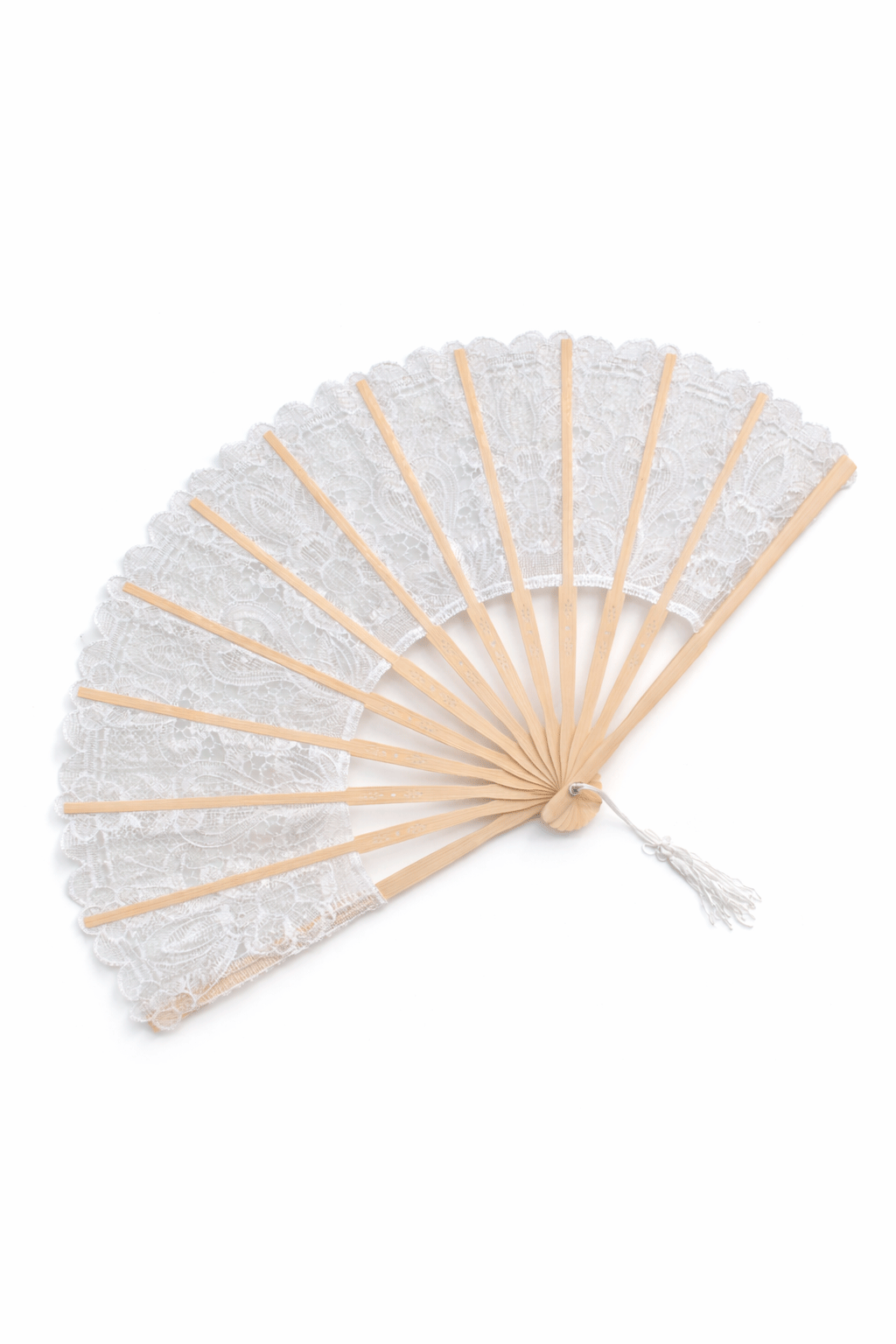 2558968 – Precioso abanico de madera color blanco decorado con encajes bordados con hilos formando motivos florales. Muy práctico además para refrescarte y marcar estilazo.