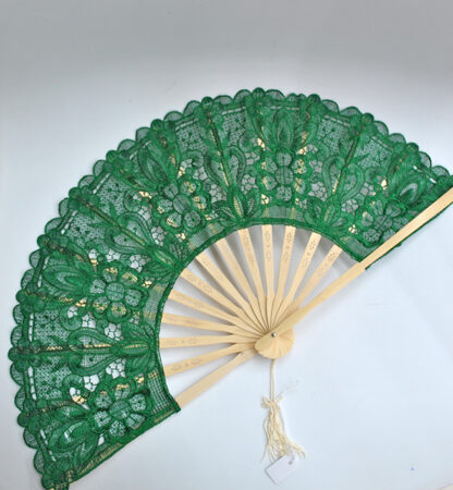 Precioso abanico de madera color VERDE decorado con encajes bordados con hilos formando motivos florales. Muy práctico además para refrescarte y marcar estilazo.