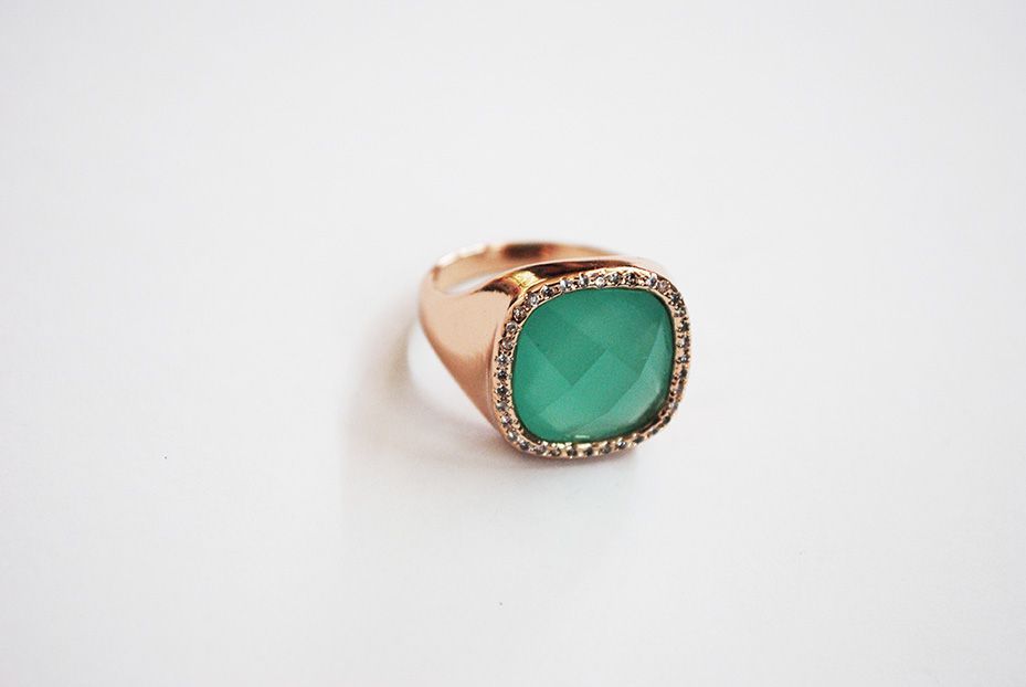 R19/2374 – Precioso anillo de mujer, fabricado en oro rosa, bisutería. Se trata de un anillo muy cómodo de llevar, decorado con un cristal cuadrado de color VERDE AGUA y decorado con pequeños brillantes.