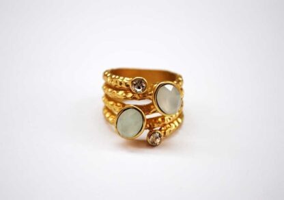 R18/1015 – Elegante anillo de bisutería. Se trata de un anillo de mujer, fabricado en metal ligero dorado mate. Dicho anillo, está decorado con dos pequeñas aplicaciones de resina en color verde agua y dos pequeños cristales blancos.