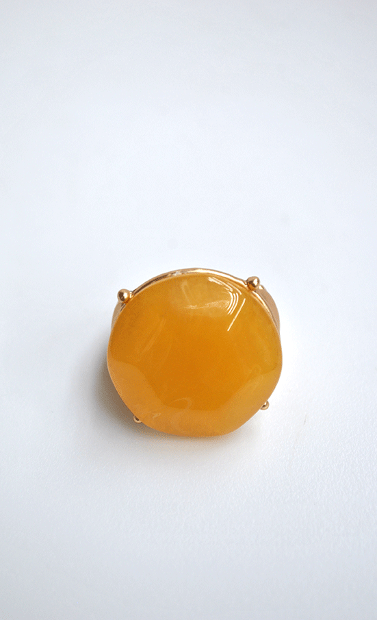 R03/5340 – Bonito y original anillo de mujer. Se trata de un anillo elástico, montado sobre bisutería dorada y decorado con una piedra redonda de cristal facetado en color mostaza.