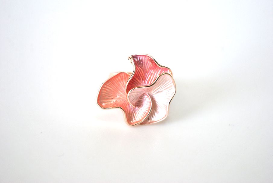 R02/4596 – Elegante anillo de mujer fabricado en bisutería oro rosa. Está decorado con esmaltes rosas combinados formando una flor. Muy cómodo y se ajusta perfectamente al dedo gracias a la goma elástica que tiene.