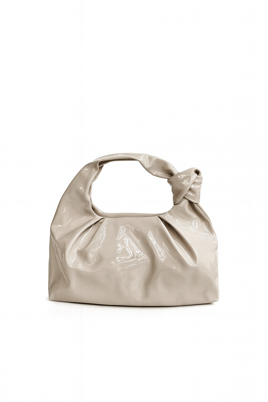 REF: 41550 – Precioso bolso de fiesta o bolso clutch taupé claro. Se trata de un bolso fabricado en charol, con un decorativo asa con el detalle de un nudo lateral. En el interior se incluye cadena larga en dorado, ideal para llevarlo colgado. ¡ Es una pasada !