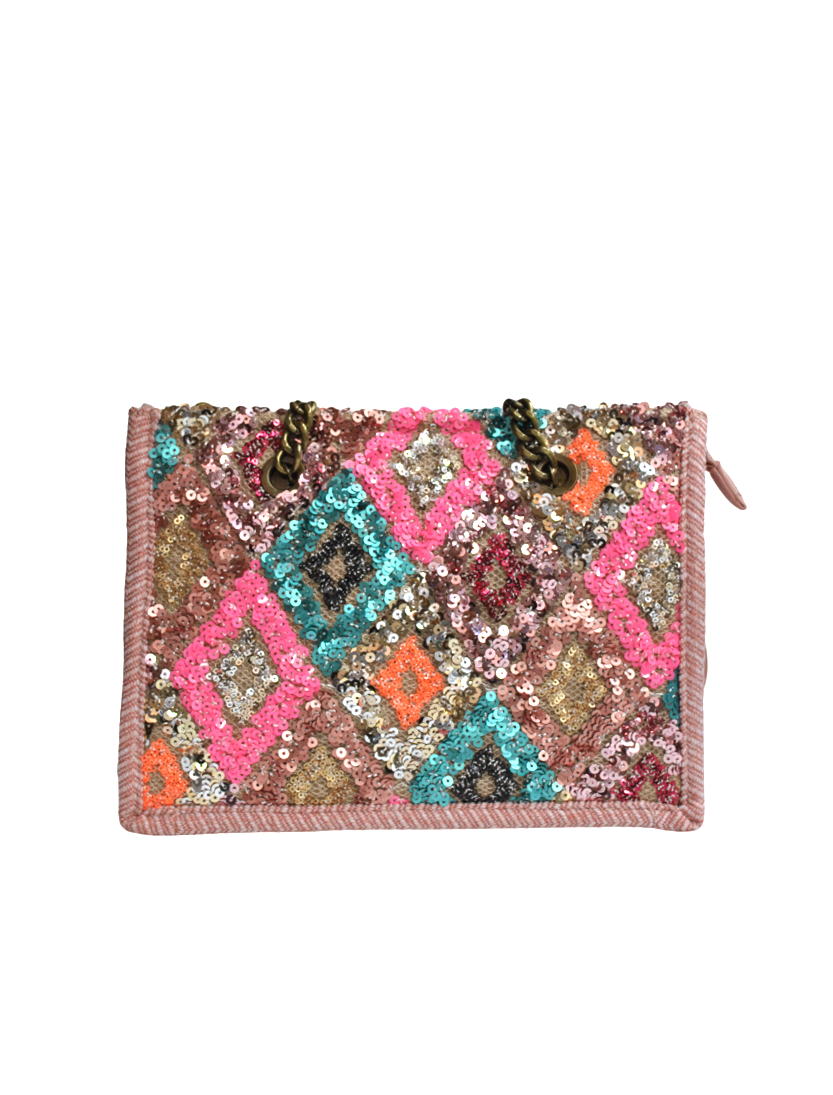 R04/5772 – Precioso bolso casual o bolso de fiesta multicolor. Se trata de un bolso de polipiel rosa con la parte delantera decorada con figuras geométricas a base de lentejuelas multicolor. Consta de dos asas con cadenas doradas para llevarlo como bolso de mano o en el hombro. Además, incluye una correa de polipiel para llevarlo como bolso bandolera. Presenta una cremallera central y un amplio interior con varios compartimentos, muy práctico y muy versátil para combinar con muchos de tus mejores looks.