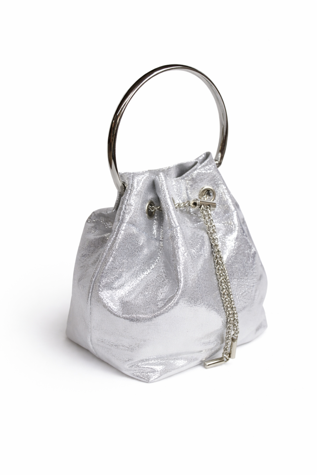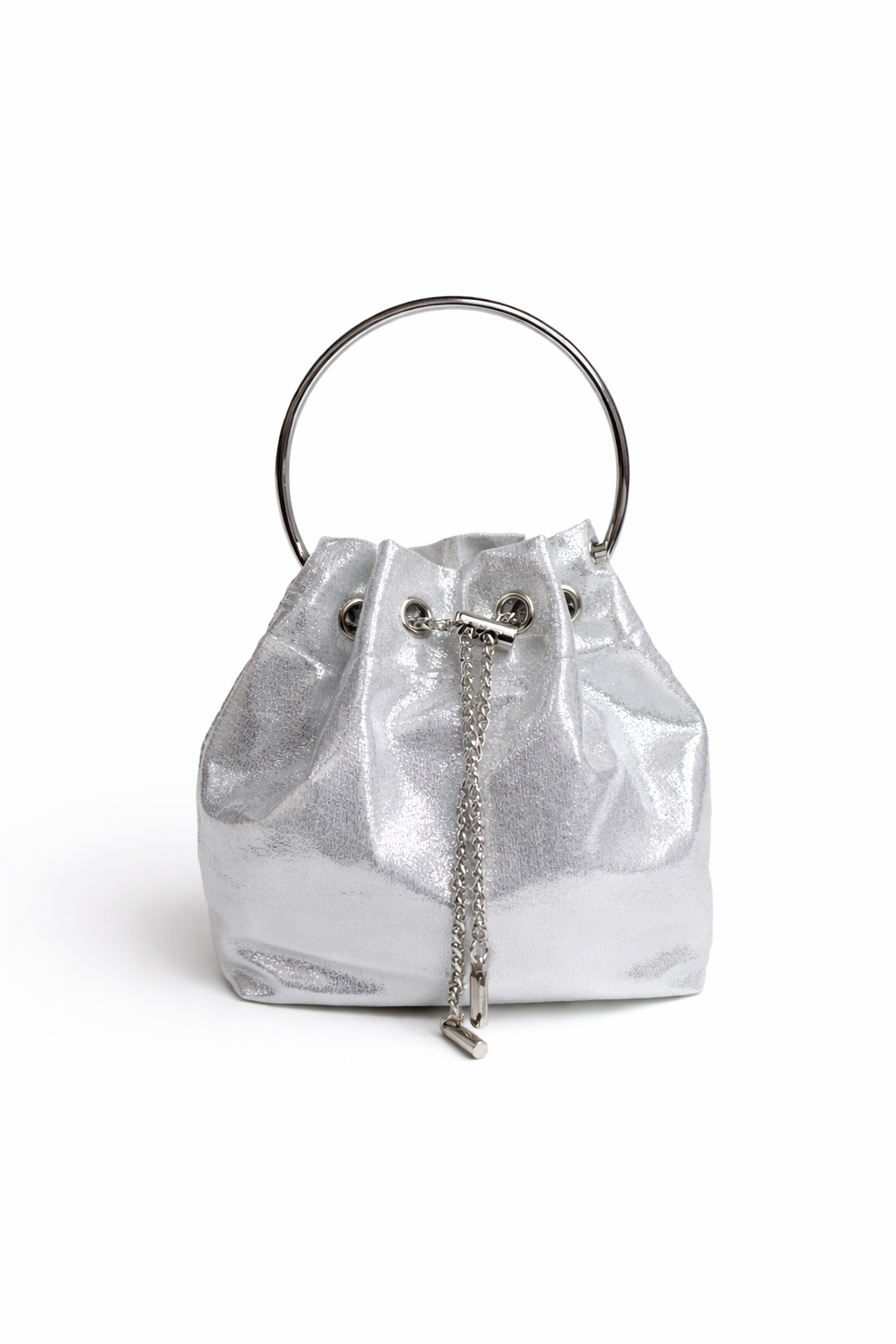 REF: 312077 – Precioso y original bolso de fiesta, clutch bombonera. Se trata de un bolso confeccionado en color plateado claro con ligero brillo. Está diseñado en forma de saquito y presenta un asa plateado de metal. Además, incluye cadena larga en el interior para llevarlo colgado.