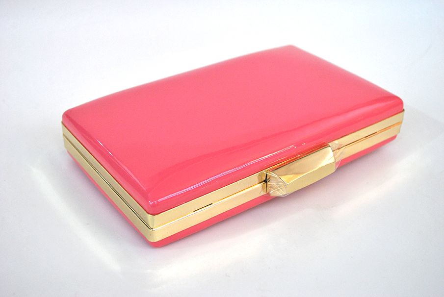 Elegante bolso clutch o cartera de fiesta de color CORAL abricado en charol, diseñado con forma rectangular. Lleva la montura y la cadena larga en dorado, detalle de cierre rectangular, cómodo y original.