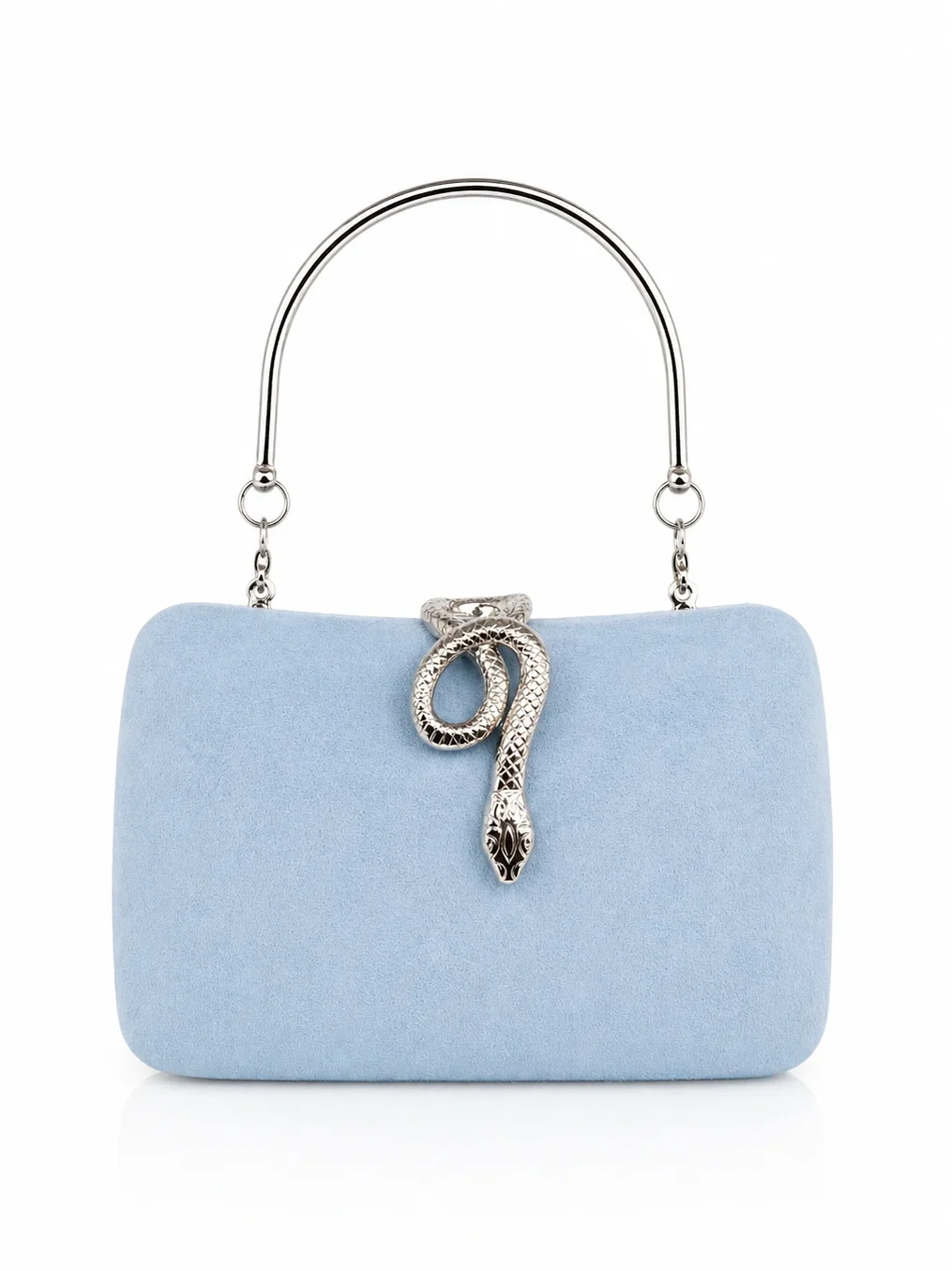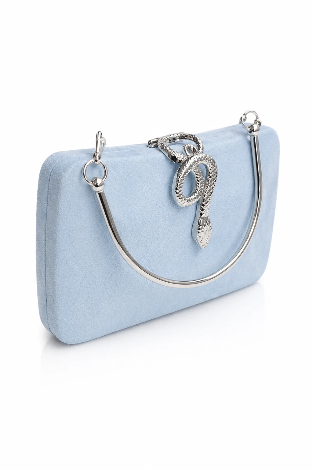 REF: PB-940320 : Elegante bolso de fiesta, bolso clutch de mano en tono azul celeste, confeccionado en acabado suave de antelina, que aporta un aspecto sofisticado y actual. Su diseño estructurado y compacto lo convierte en el complemento perfecto tanto para eventos especiales como para elevar looks diarios.