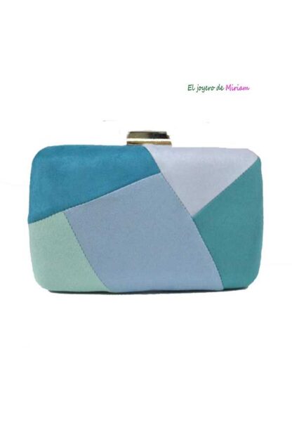 R02/4689 -Elegante y original bolso clutch de fiesta, diseñado ligeramente rectangular fabricado en antelina. Presenta una bonita combinación de tonos azules. Destaca el broche rectangular en dorado y consta de cadena también dorada en el interior para llevarlo más cómodamente colgado.