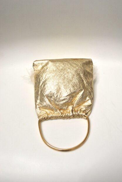 RDV0909245878 – Precioso bolso de fiesta clutch en color dorado. Se trata de un bolso diseñado en forma de saquito, forrado en tela de polipiel oro rosa con detalle delantero faldón de vaporosas plumas y, un original asa doble dorado para llevarlo como bolso de mano.