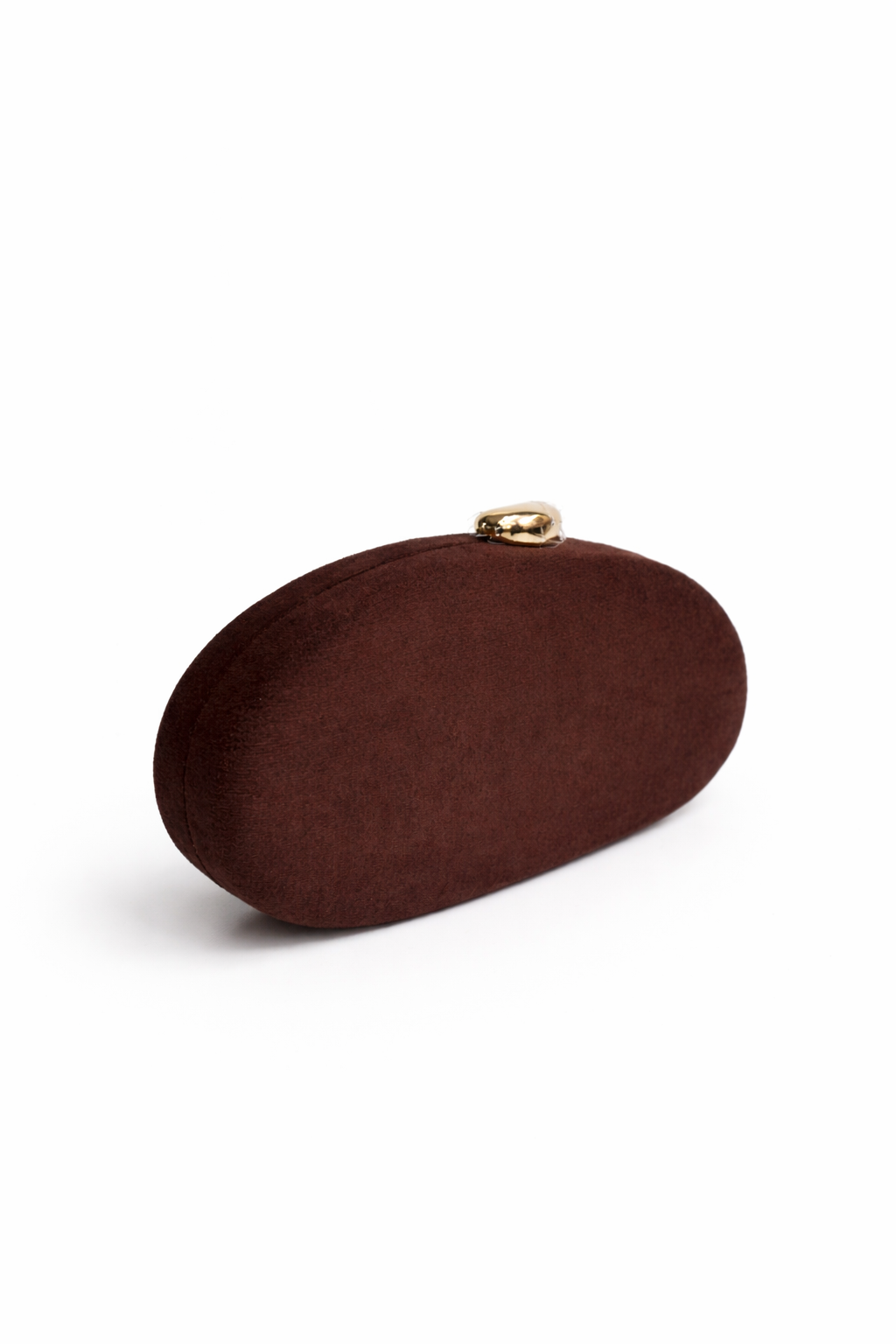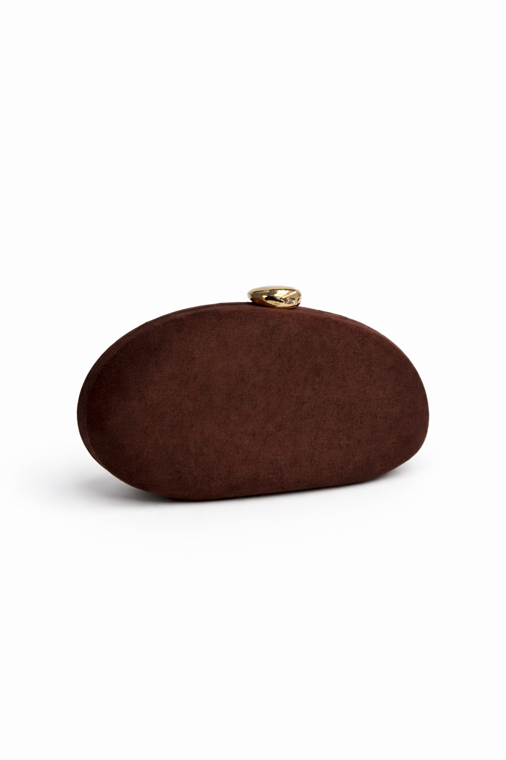 REF: 312049 – Bolso de fiesta, clutch rígido en tono marrón confeccionado en tela de antelina suave y diseño ovalado, perfecto para eventos, bodas y ocasiones especiales. Su forma elegante y minimalista se combina con un cierre superior dorado que aporta un toque sofisticado y exclusivo. Compacto pero funcional, ideal para llevar lo imprescindible con estilo. Un bolso atemporal, elegante y muy favorecedor que elevará cualquier look de invitada. En el interior se incluye cadena larga dorada para colgar.