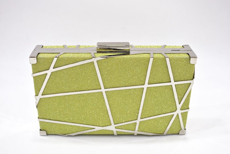 R02/4869 -Precioso y original bolso clutch, cartera de fiesta decorado con glitter VERDE LIMA. Se trata de un bolso muy original por su diseño; cuenta con la forma rectangular y, está decorado a base de bandas de METAL PLATEADO formando atractivas figuras geométricas. Por último, cuenta con cadena dorada para colgar.