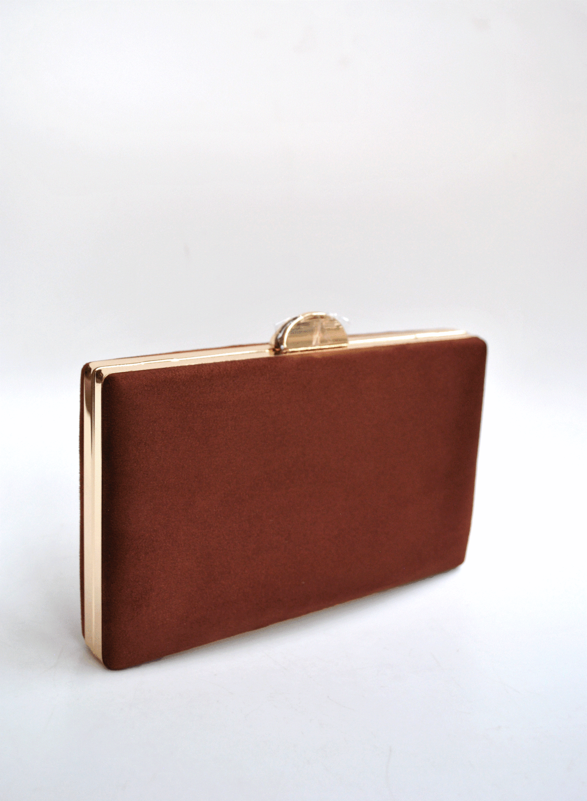 REF: 5624 – Elegante bolso clutch o cartera de fiesta de color MARRÓN TIERRA fabricado en antelina, diseñado con forma rectangular. Lleva la montura y la cadena larga en dorado, detalle de cierre en forma de media luna, cómodo y original.