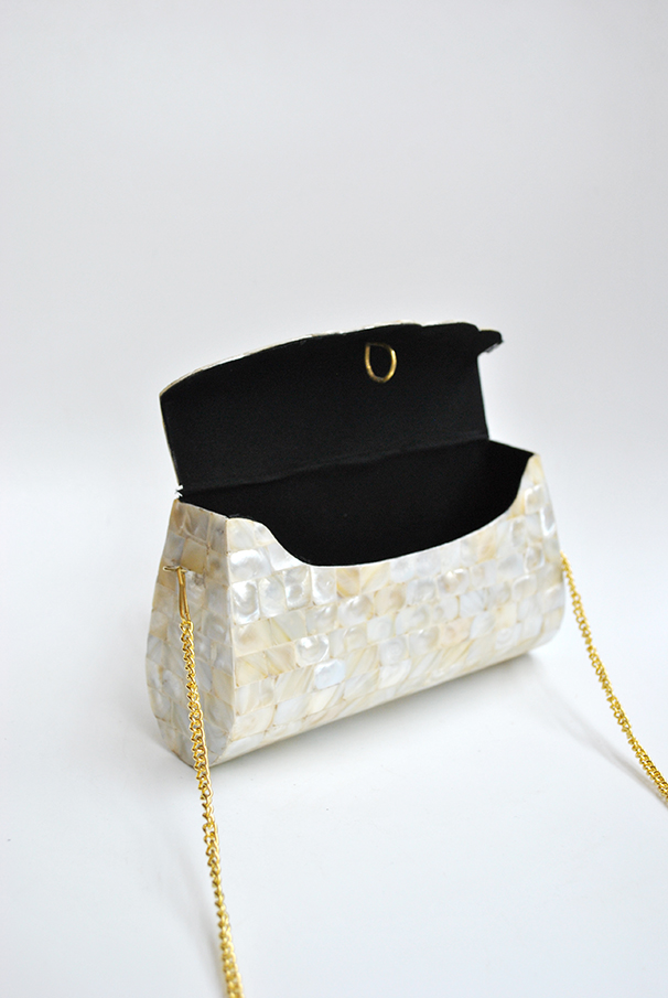 R03/5215 – Precioso y original bolso clutch rígido BLANCO PERLA de fiesta. Se trata de un bolso de fiesta fabricado artesanalmente y diferente por su bonito diseño; rígido y decorado con incrustaciones nacaradas en blanco perla. Sin duda, un bolso ideal para que luzcas como la invitada ideal ¡Es espectacular! Consta de cadena dorada para llevarlo más cómodamente colgado.