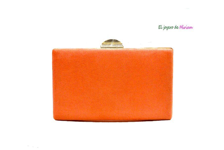 R04/5664- Elegante bolso clutch o cartera de fiesta de color NARANJA fabricado en antelina, diseñado con forma rectangular. Lleva la montura y la cadena larga en dorado, detalle de cierre de media luna cómodo y original.