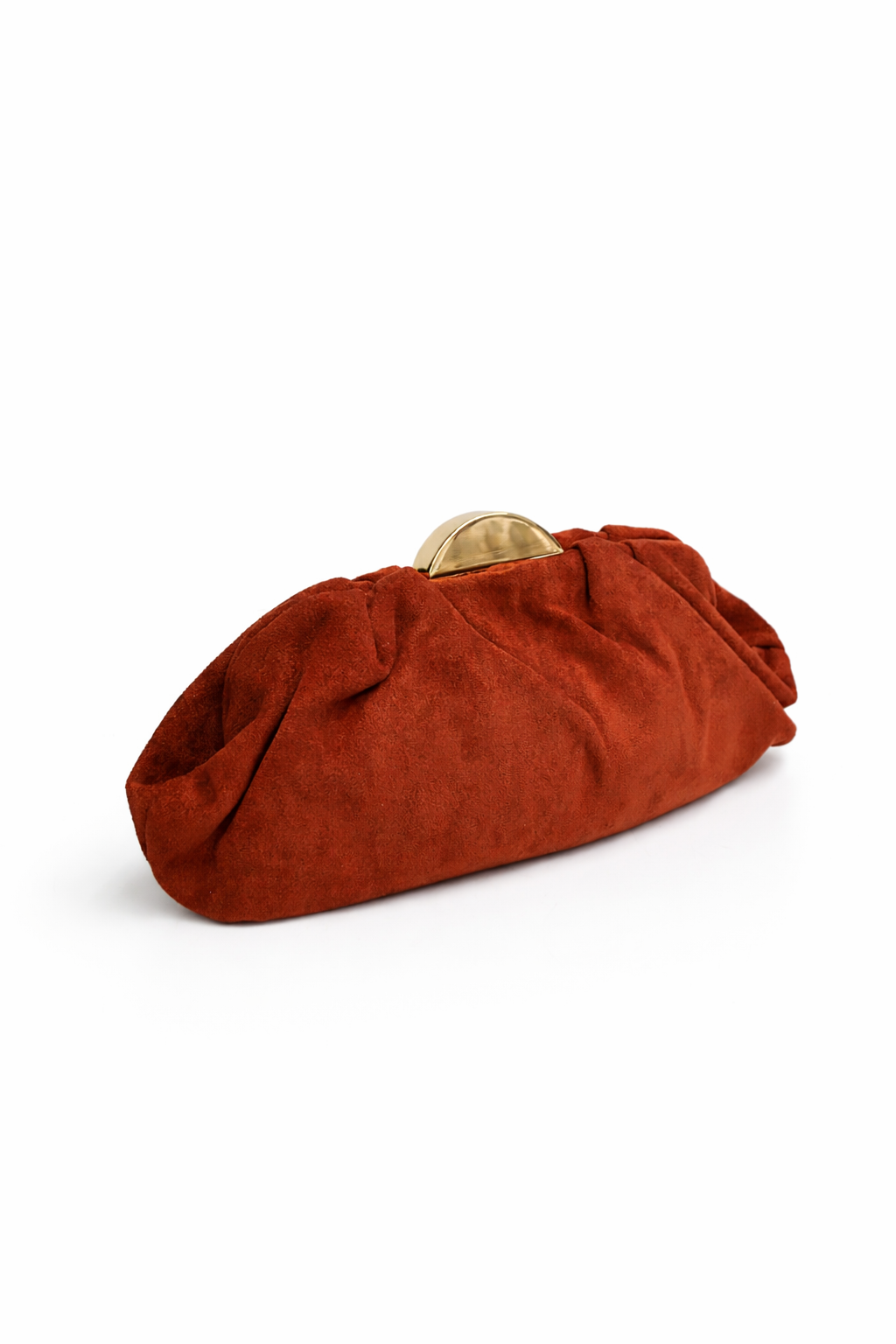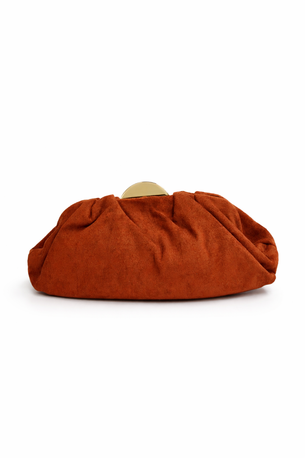 REF: 312630 – Elegante clutch de fiesta en tono teja, confeccionado en un tejido de antelina con pliegues que aportan volumen y sofisticación. Su cierre metálico dorado semicircular añade un toque de distinción, convirtiéndolo en el accesorio perfecto para invitadas, eventos de noche, bodas y ocasiones especiales. Ligero, cómodo de llevar y con capacidad para lo esencial. Incluye cadena larga en dorado.
