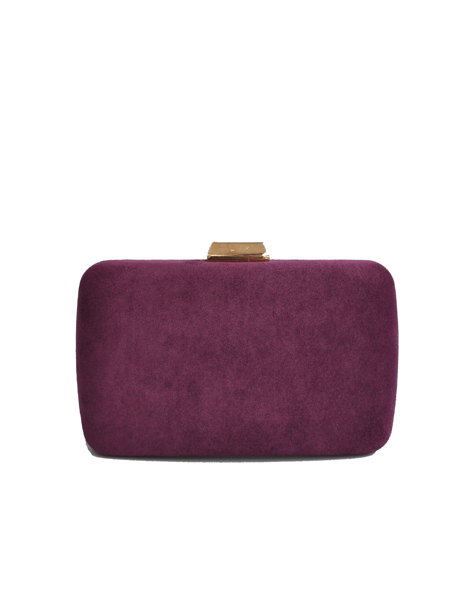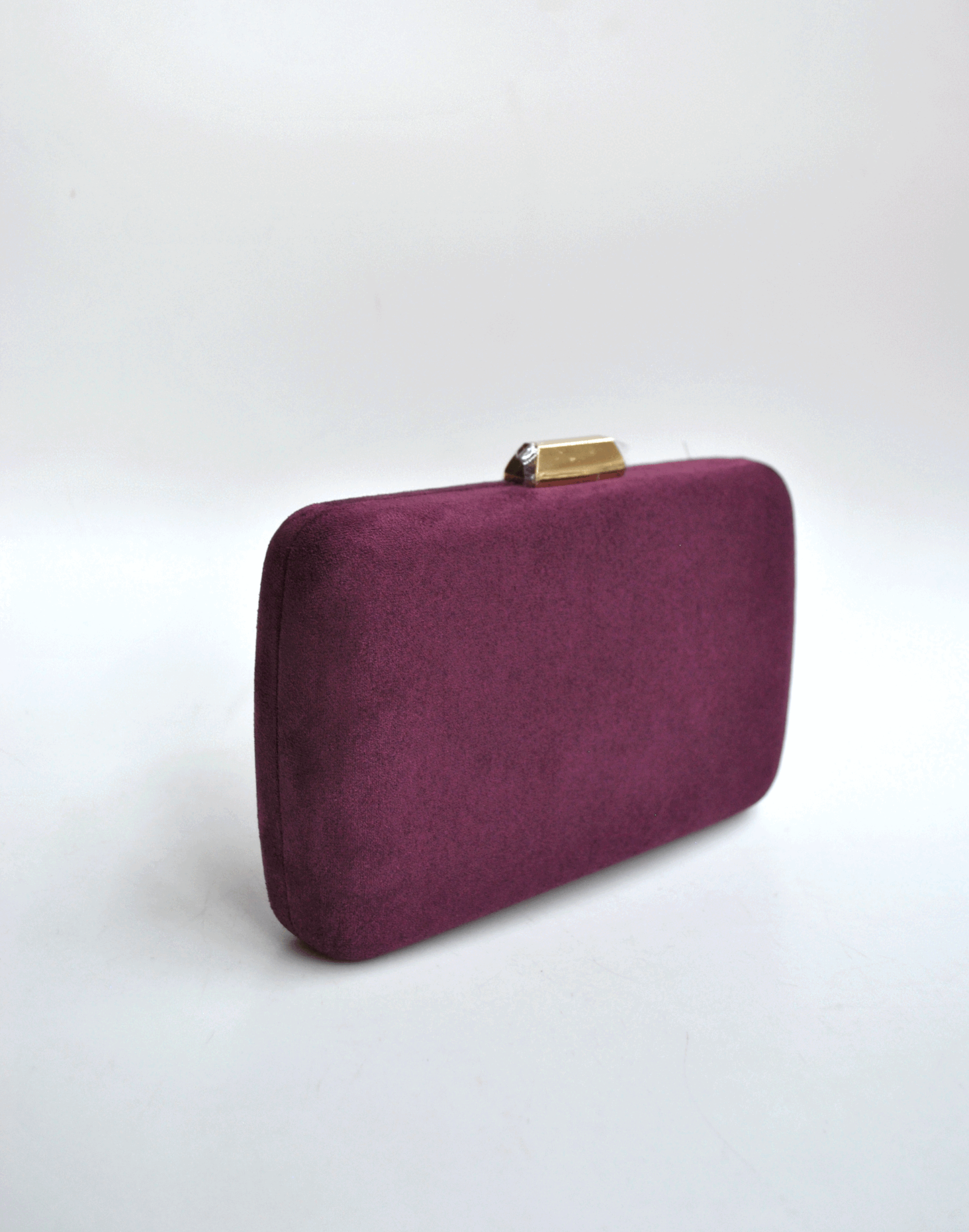 REF: 01253 – Elegante y bonito bolso de fiesta o clutch berenjena. Se trata de un bolso diseñado con forma ovalada, forrado de antelina en un precioso color berenjena. Presenta el broche rectangular en metal dorado y, además, incluye cadena dorada para llevarlo colgado.