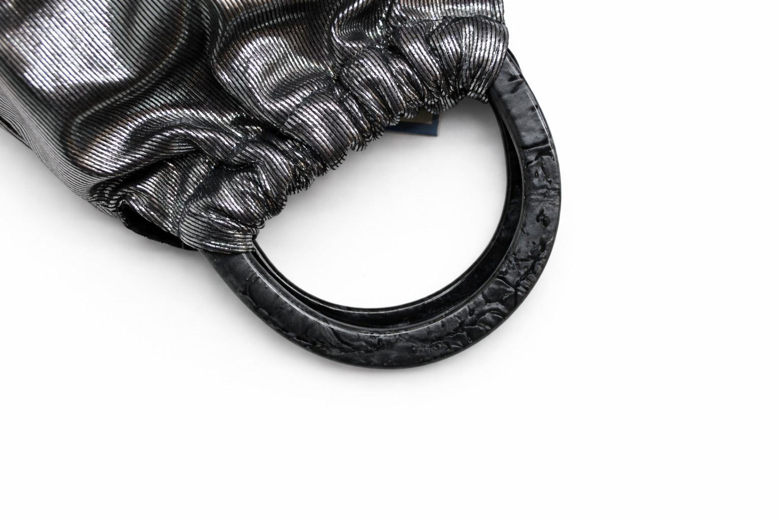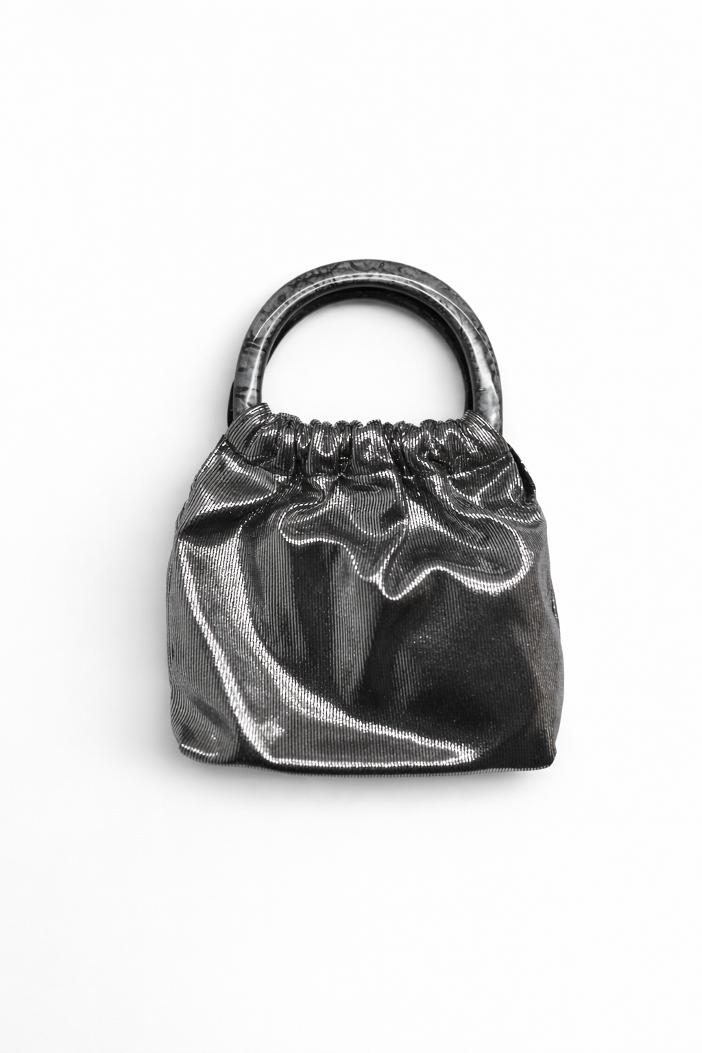 REF: 20745 – Elegante y luminoso bolso de fiesta, clutch estilo bombonera en color plata envejecida, con delicado acabado metalizado es el complemento perfecto para eventos y ocasiones especiales. Su diseño fruncido aporta un aire sofisticado y femenino, mientras que el asa rígida de resina en efecto nácar marmoleado le da un toque moderno y exclusivo. Incluye cadena larga en el interior para llevarlo colgado.
