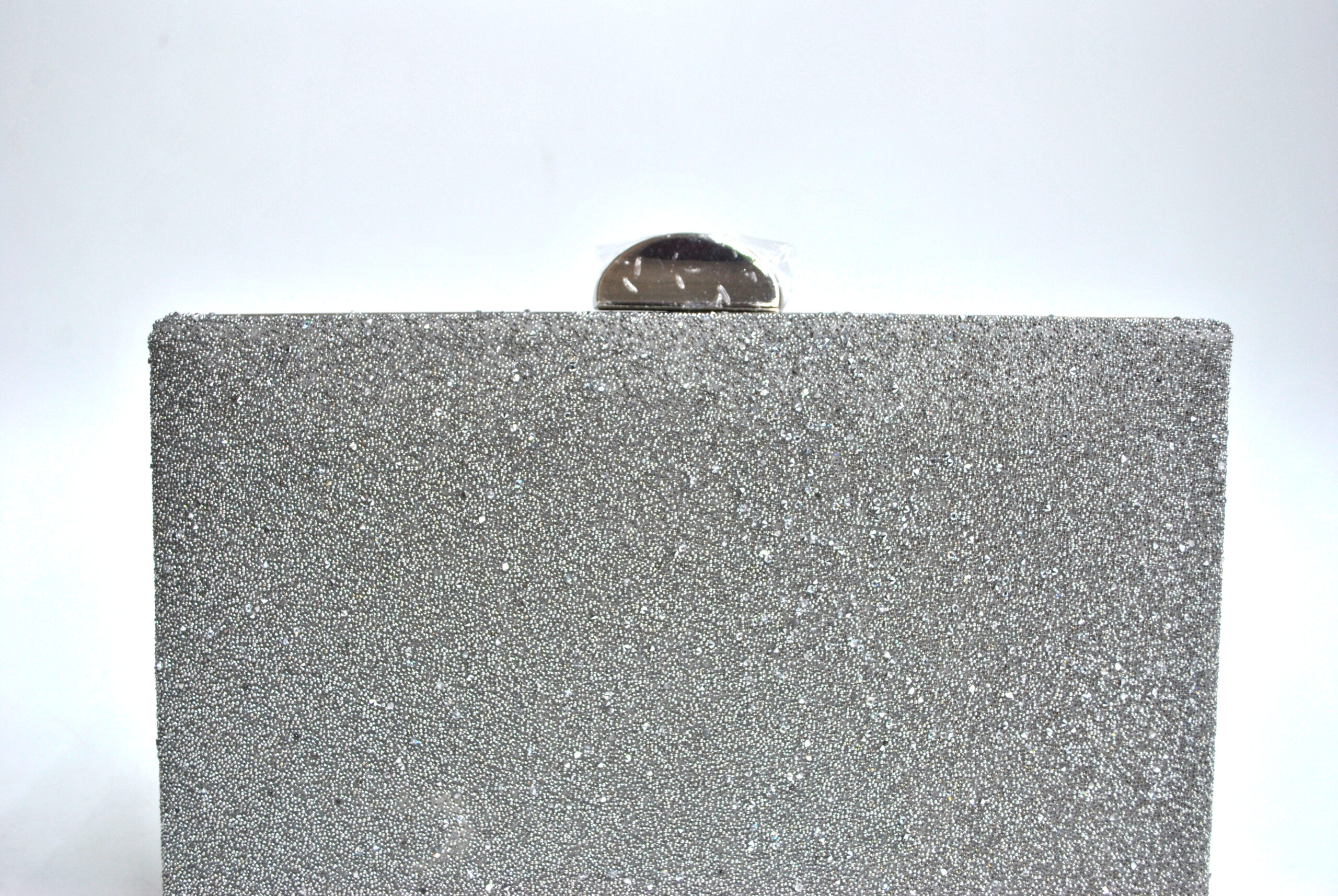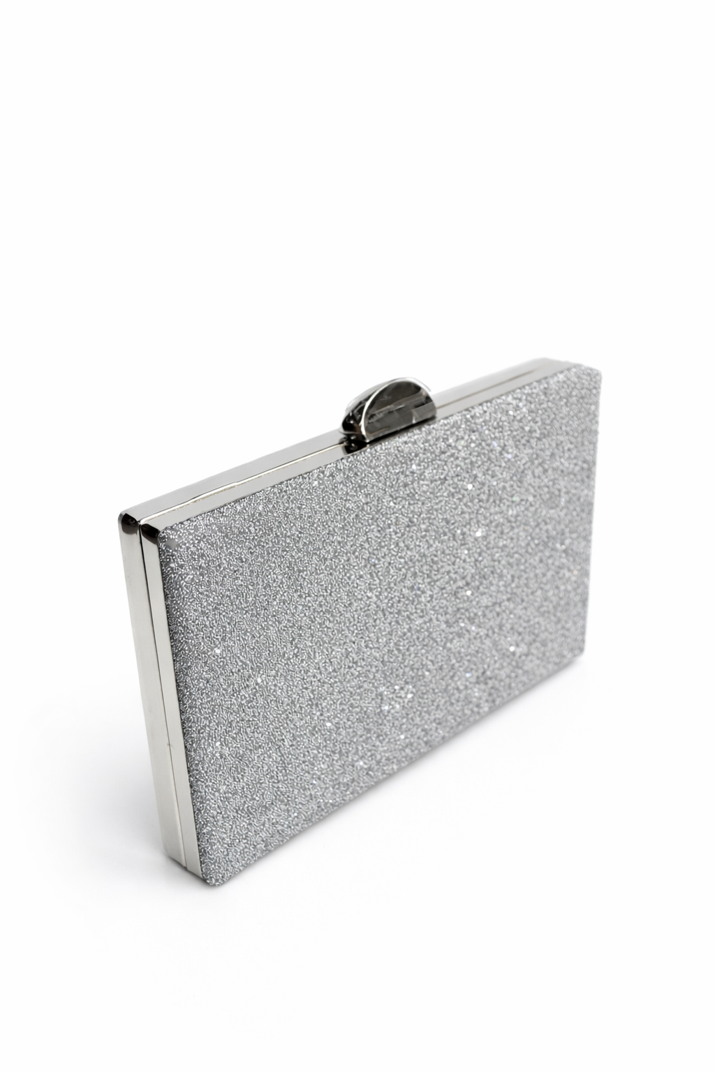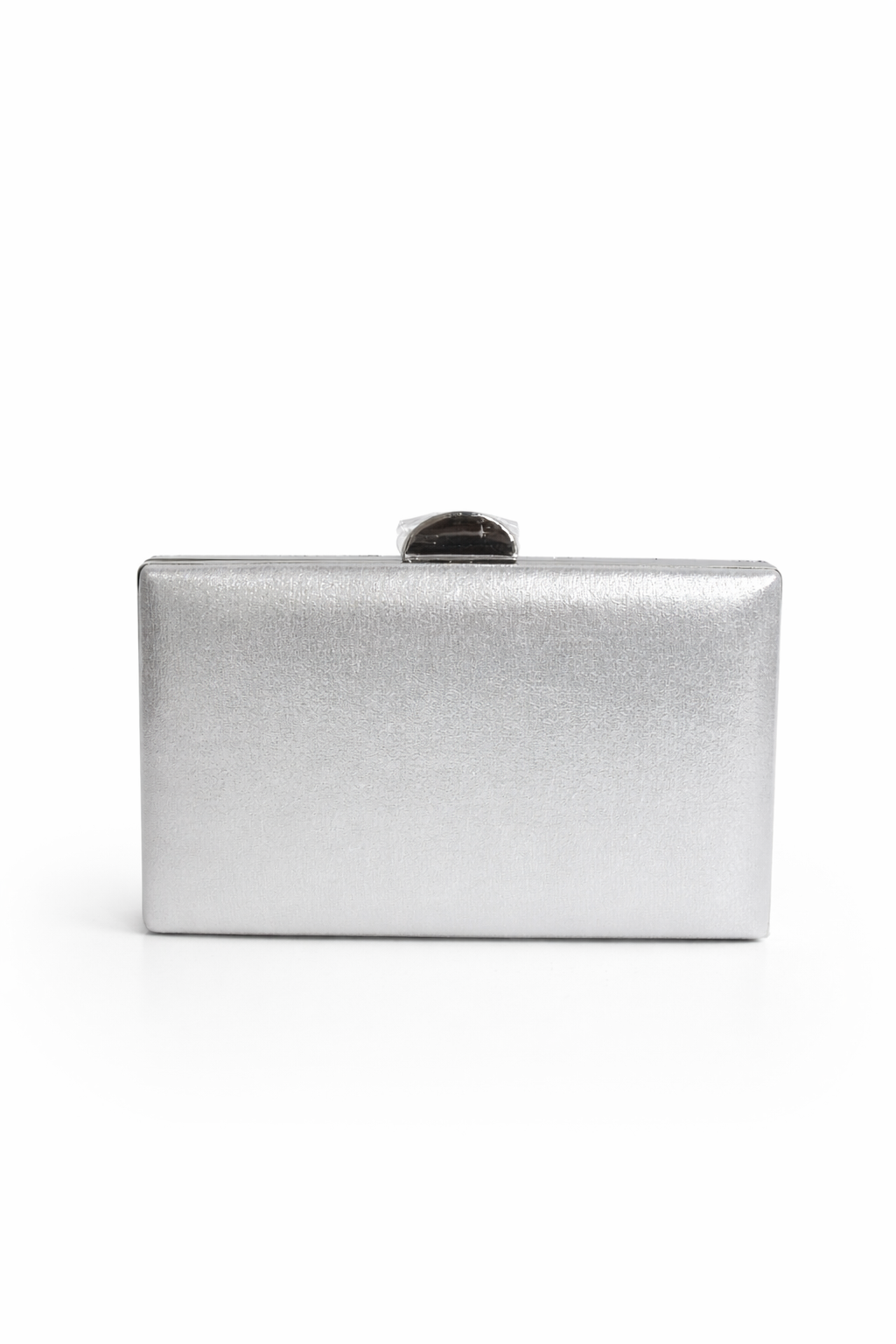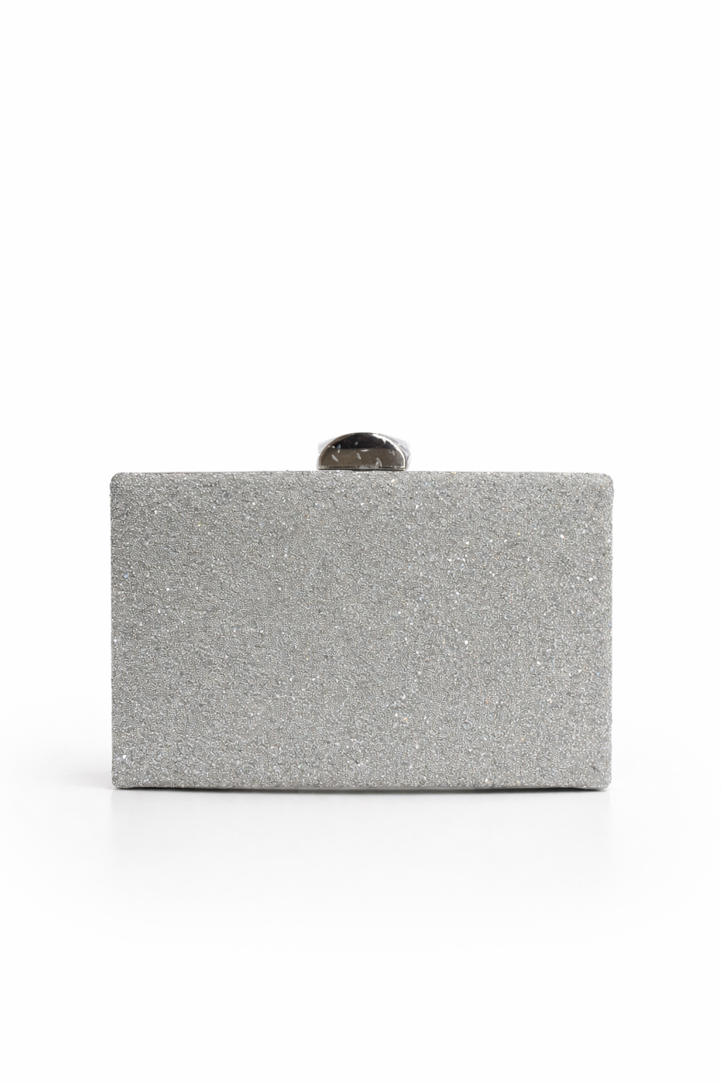 REF: 382027 – Precioso y elegante bolso de fiesta bolso clutch plateado. Se trata de un bolso diseñado en forma rectangular, con cierre de media luna en metal plateado. La parte delantera está decorada con ligeros y elegantes brillos sutiles en color plateado, bolso ideal para lucir como la invitada o madrina perfecta. La parte trasera del bolso está confeccionada en polipiel plateado. Además, en el interior se incluye una cadena larga en plateado.