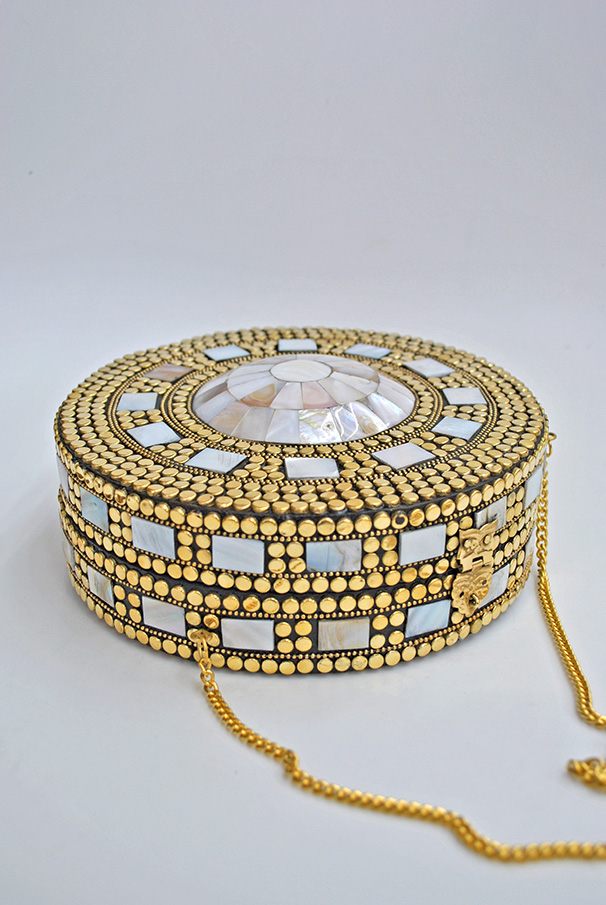R03/5314 – Precioso y original bolso clutch rígido dorado de fiesta. Se trata de un bolsito muy original por su diseño; fabricado en metal rígido en color dorado y decorado a base de tachuelas doradas con preciosas incrustaciones de nácar. ¡Ideal y muy original, un bolso de fiesta con el que marcarás la diferencial! Con este bolso clutch dorado serás el centro de atención de todas las miradas. Incluye cadena dorada para llevarlo más cómodamente colgado.