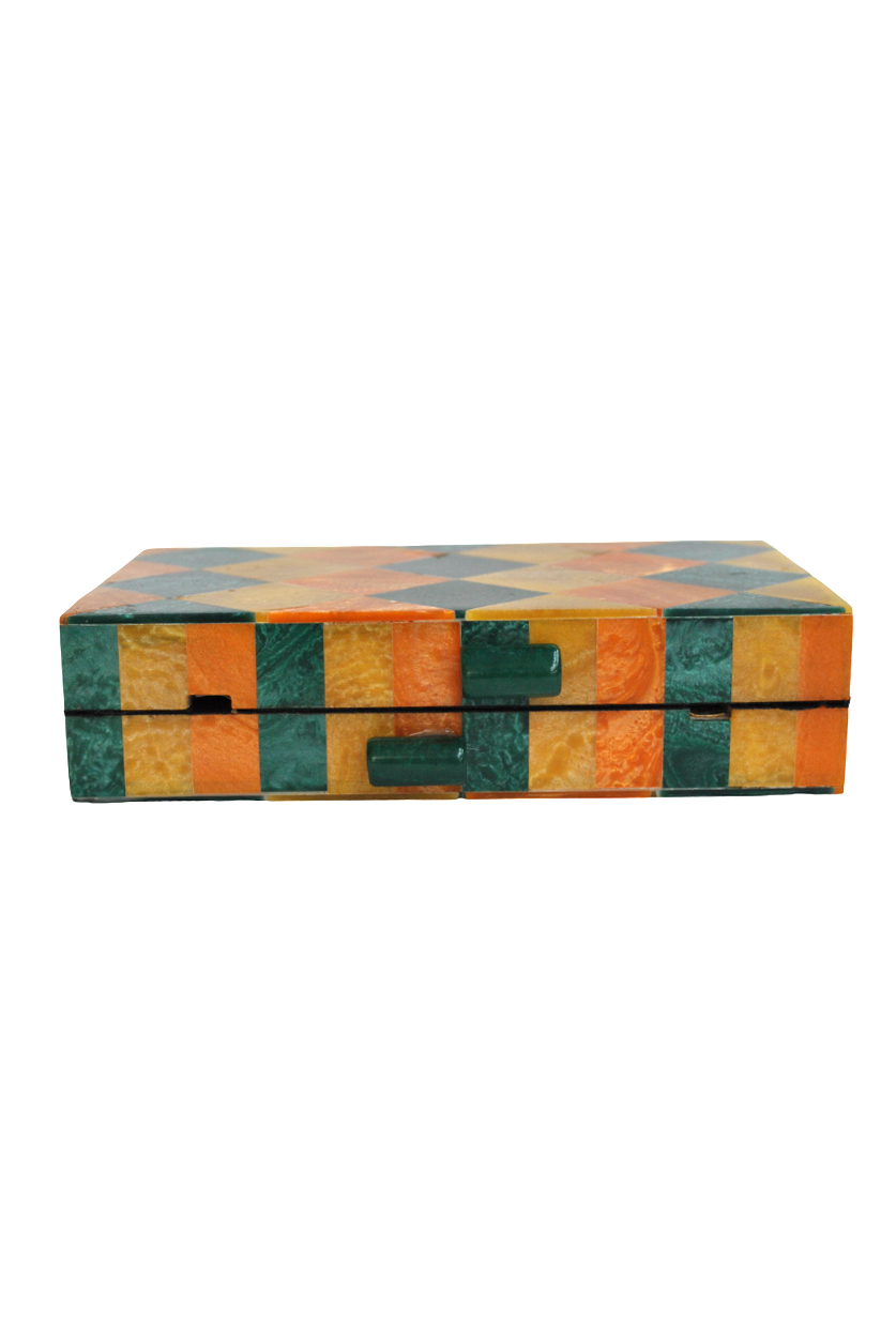 R04/5702 – Espectacular bolso de fiesta rígido fabricado artesanalmente en madera y diseñado en forma de cajita. Está decorado con incrustaciones de resina y, presenta decoraciones de mosaicos geométricos combinados en tonos verdes, mostazas y naranjas. Consta de cierre de imán y presenta cadena dorada para llevarlo más cómodamente colgado.