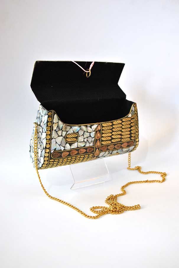R03/4937 – Glamuroso y estiloso bolso de fiesta clutch rígido. Se trata del bolso perfecto para cualquier invitada ideal. Está fabricado artesanalmente en resina y presenta decoraciones de latón dorado combinado con latón color cobre. No podemos olvidar destacar las incrustaciones de nácar. Incluye cadena dorada para llevarlo más cómodamente colgado.