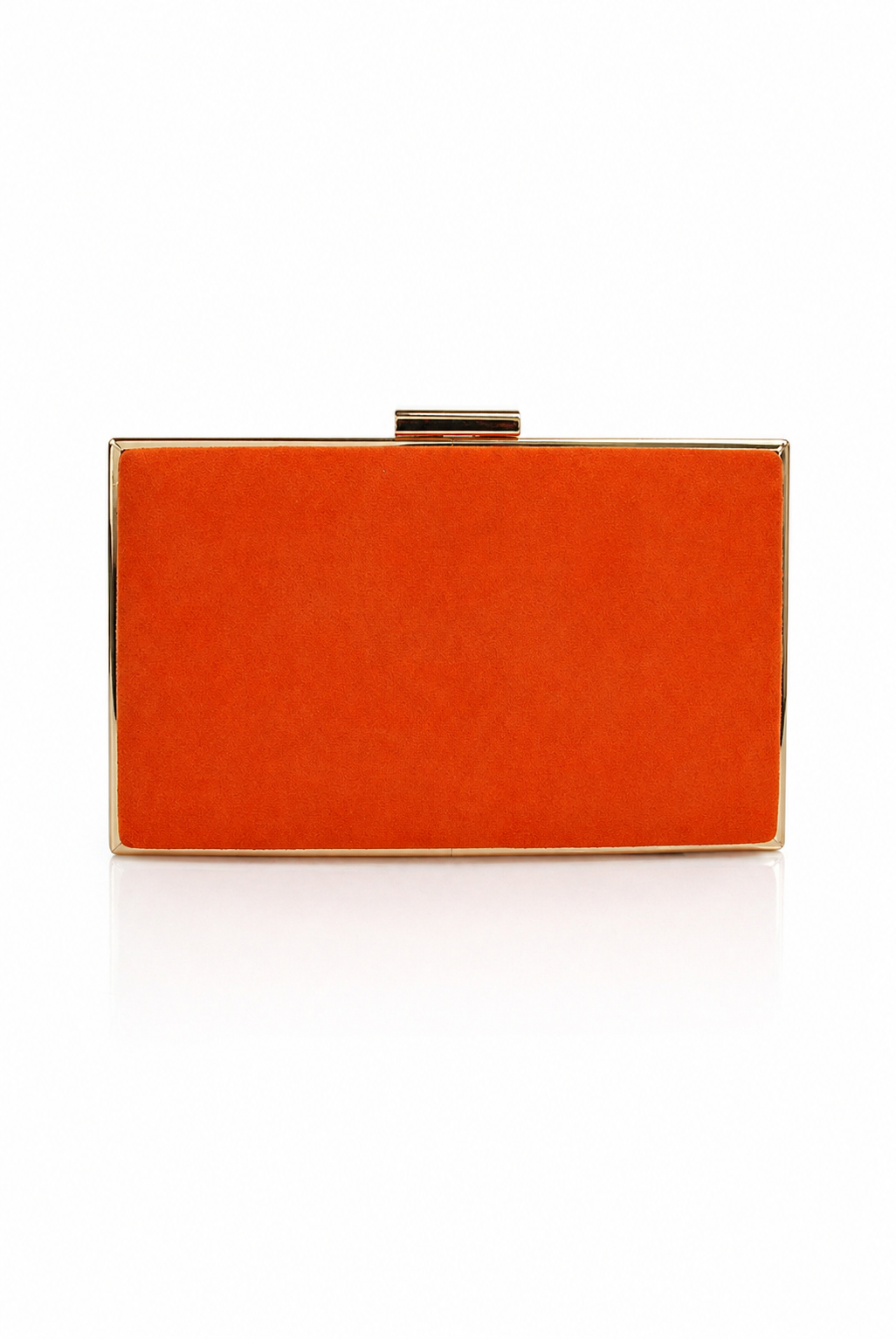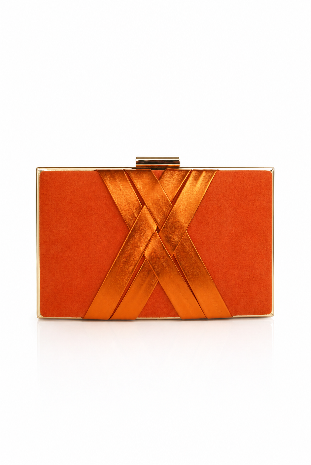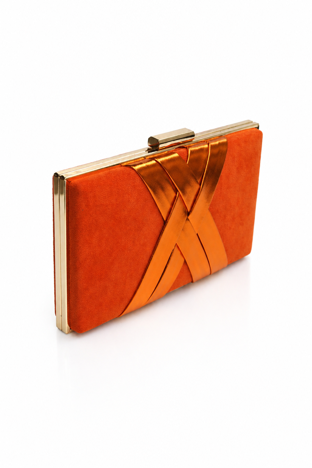 REF: PB-194032 – Precioso bolso de fiesta clutch rectangular. Se trata de un bolso confeccionado en tela de antelina y con detalle frontal de un trenzado en polipiel de color naranja metalizado. La montura y el broche rectangular es en dorado. Además en el interior se incluye cadena larga en dorado.