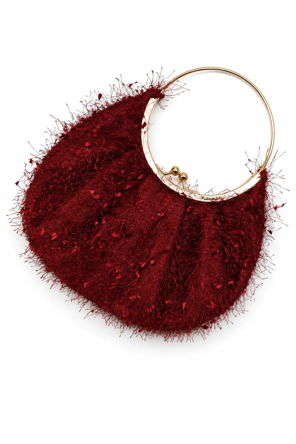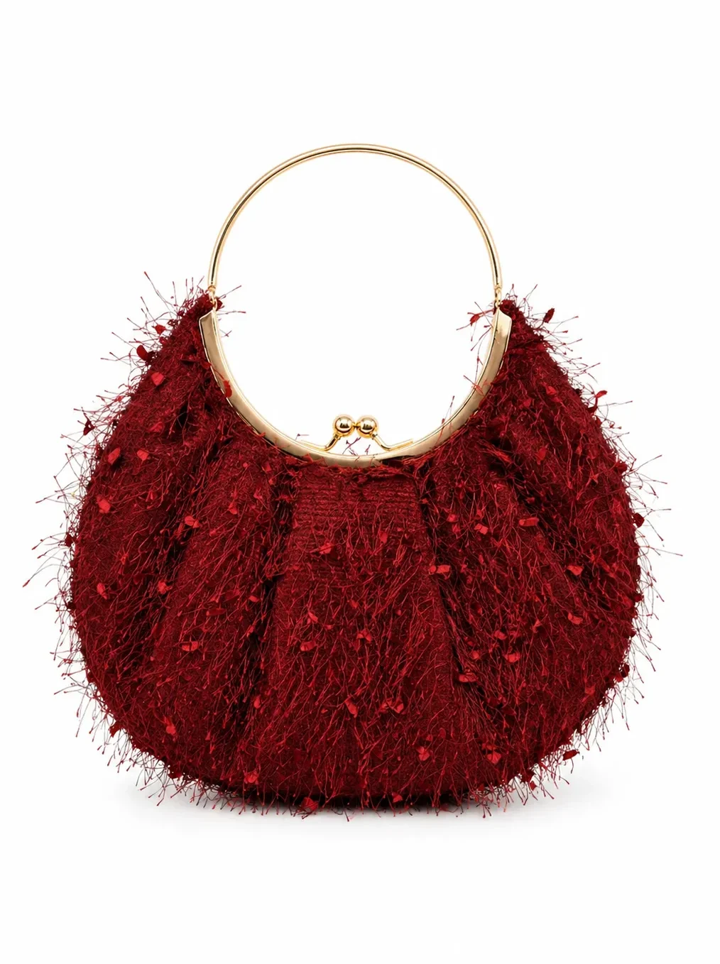 REF: KC-100099 – Precioso bolso de fiesta, bolso clutch de diseño exclusivo en un sofisticado tono burdeos , perfecto para destacar en eventos y ocasiones especiales. Su acabado con textura tweed tipo pluma y pequeños destellos aporta volumen, movimiento y un efecto visual único lleno de elegancia.
