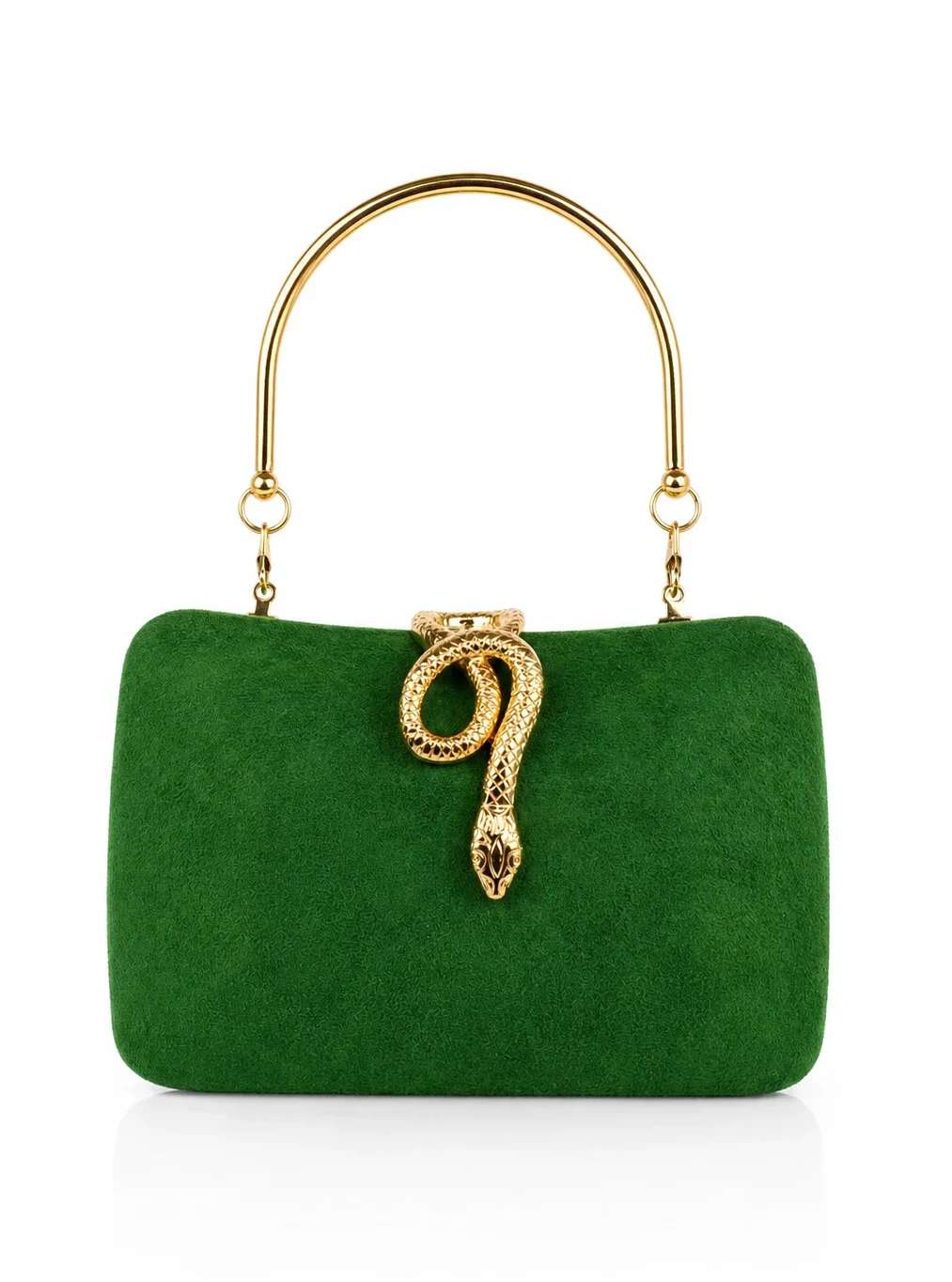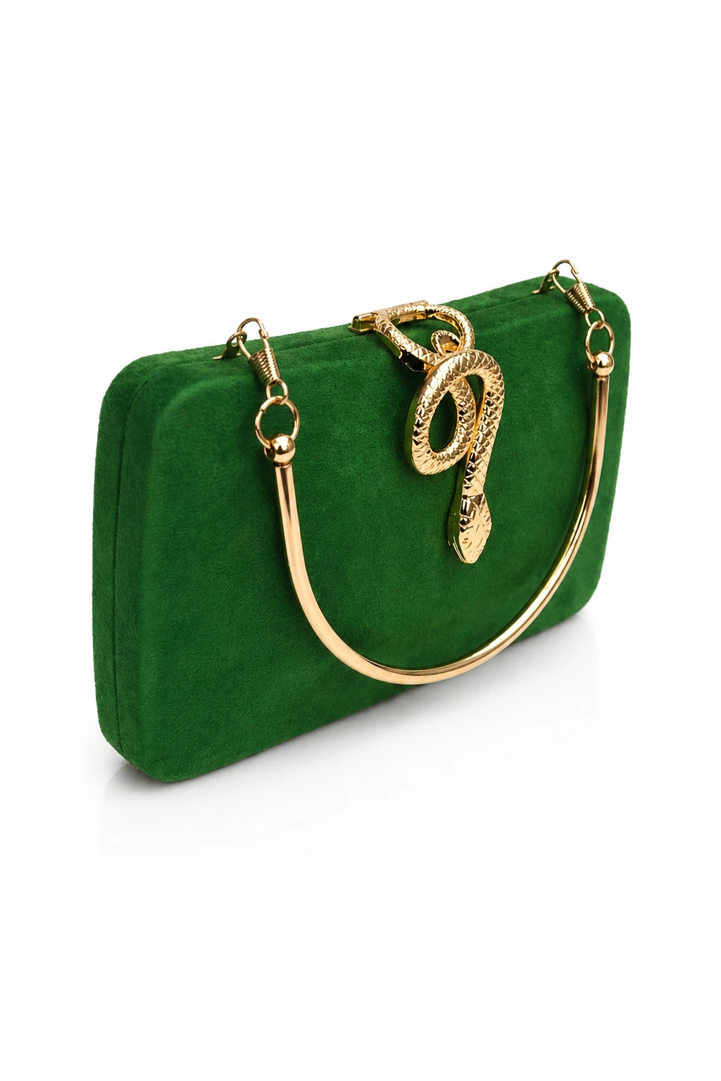 REF: PB-940320 : Elegante bolso de fiesta, bolso clutch de mano en tono verde, confeccionado en acabado suave de antelina, que aporta un aspecto sofisticado y actual. Su diseño estructurado y compacto lo convierte en el complemento perfecto tanto para eventos especiales como para elevar looks diarios.