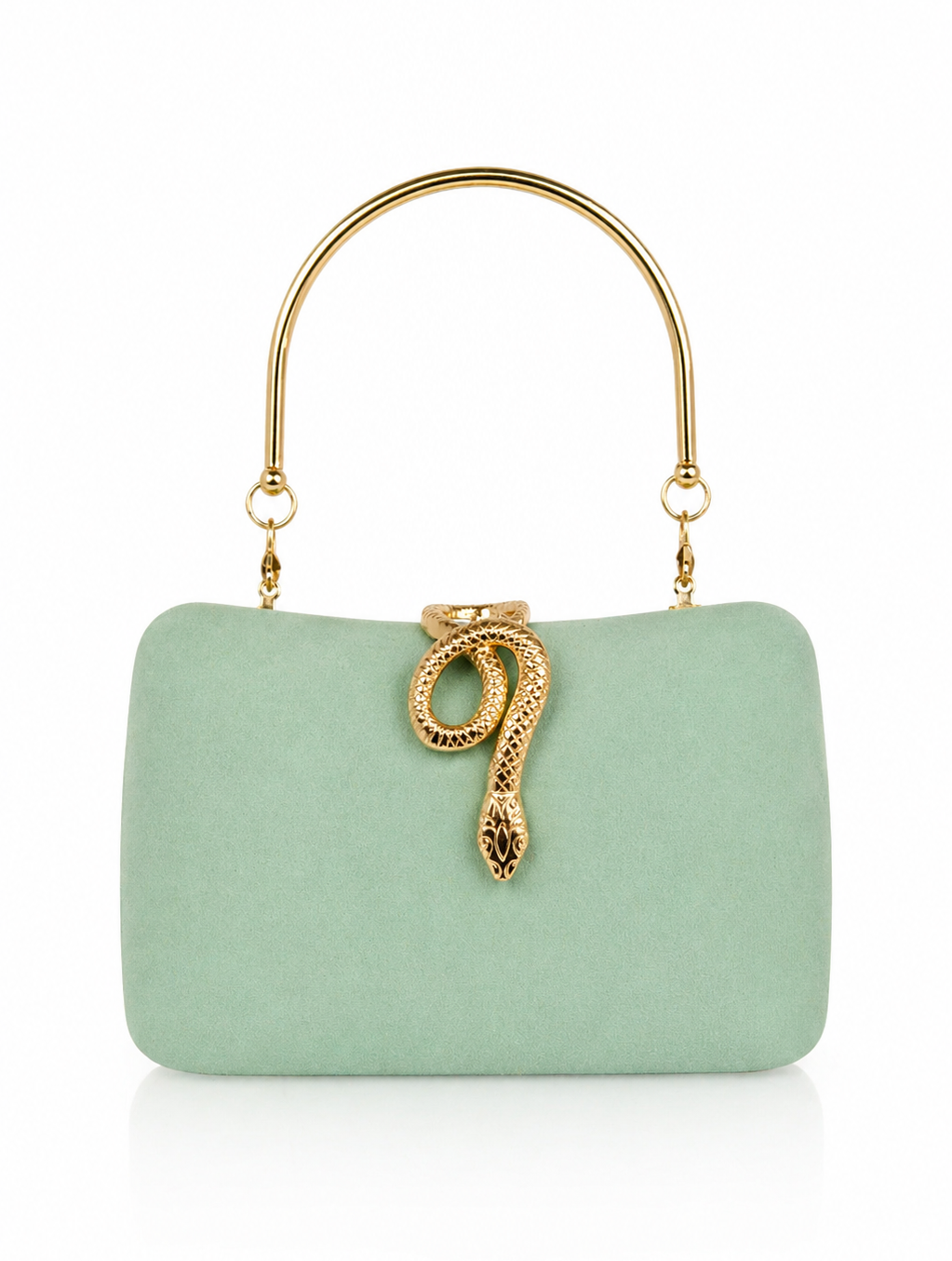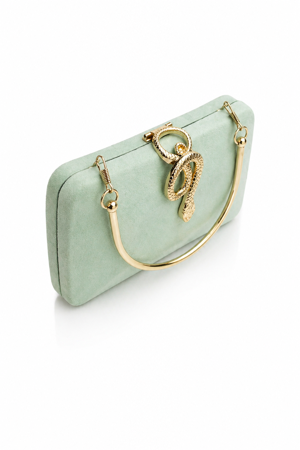 REF: PB-940320 : Elegante bolso de fiesta, bolso clutch de mano en tono verde menta, confeccionado en acabado suave de antelina, que aporta un aspecto sofisticado y actual. Su diseño estructurado y compacto lo convierte en el complemento perfecto tanto para eventos especiales como para elevar looks diarios.