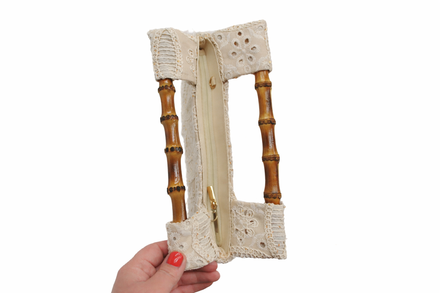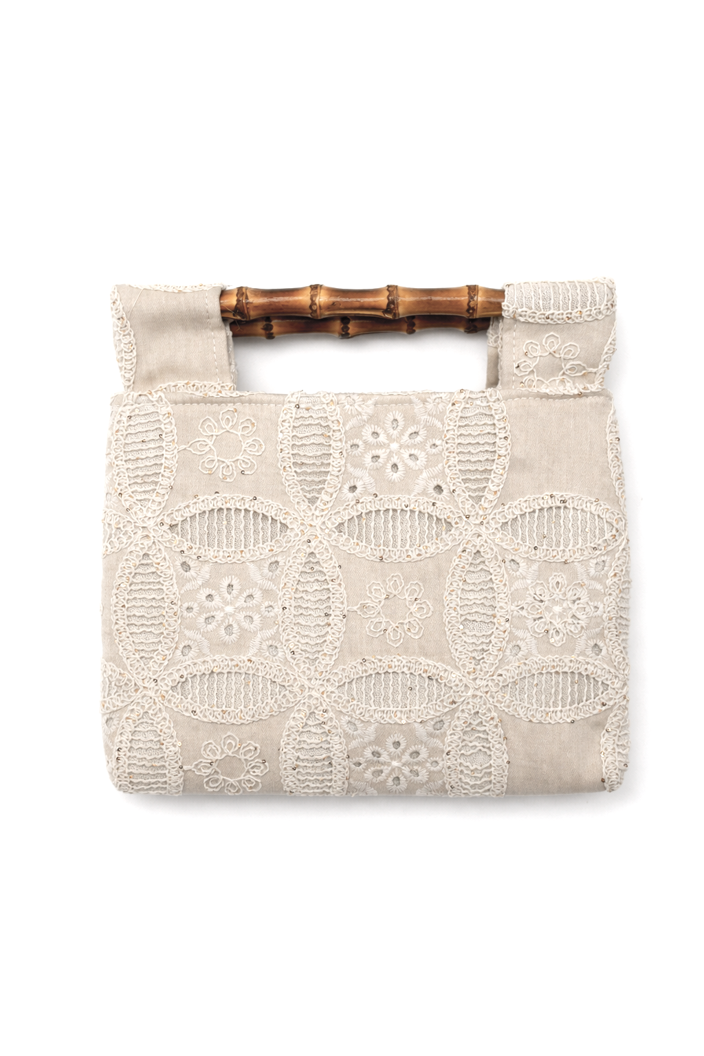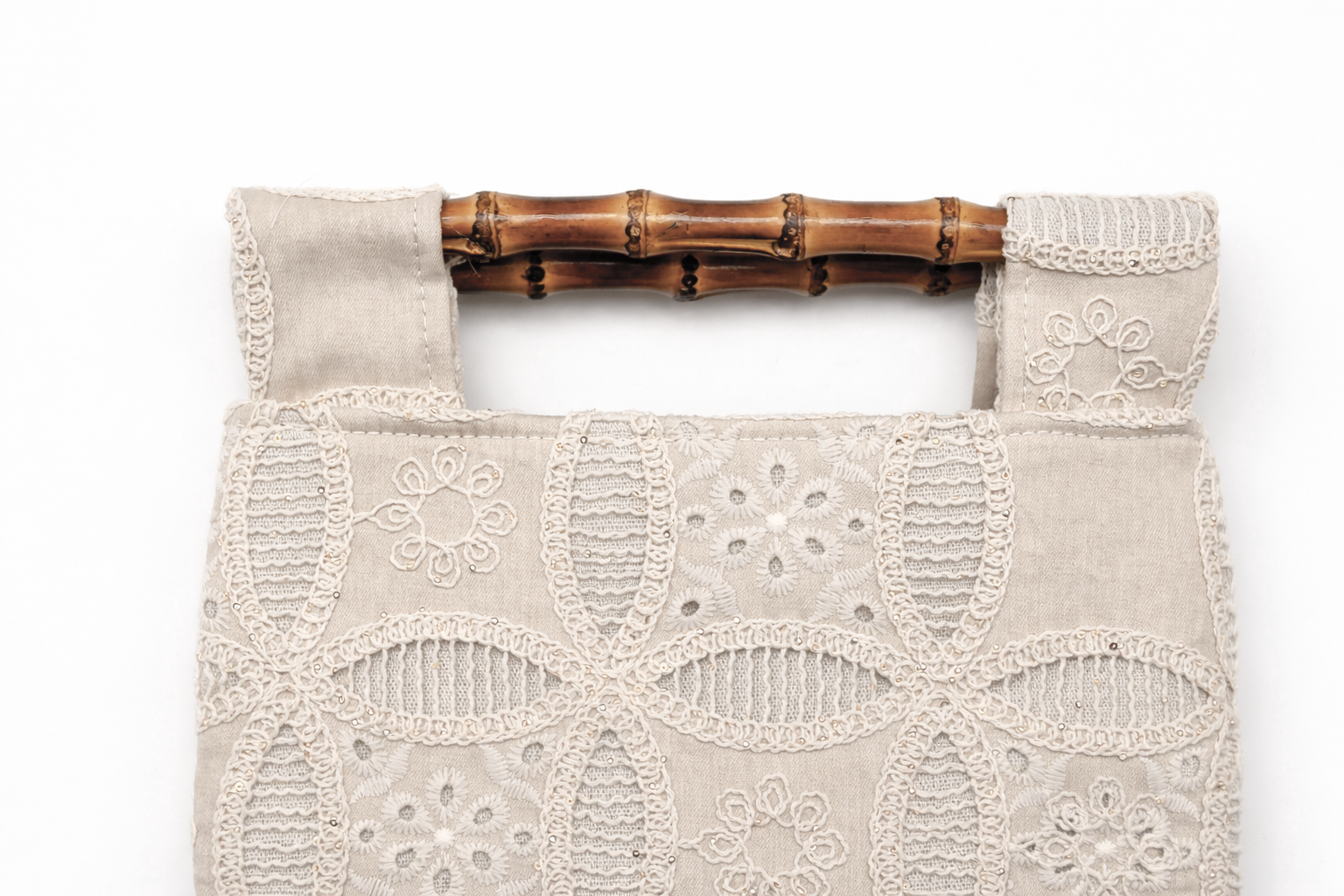 REF: 20271 – Precioso y estiloso bolso de mano o bandolera (incluye correa larga en el interior) confeccionado en tejido beige con delicado encaje bordado en relieve, creando un diseño sofisticado y femenino. Sus asas rígidas de bambú natural aportan un contraste cálido y elegante, convirtiéndolo en una pieza con mucho estilo y personalidad.