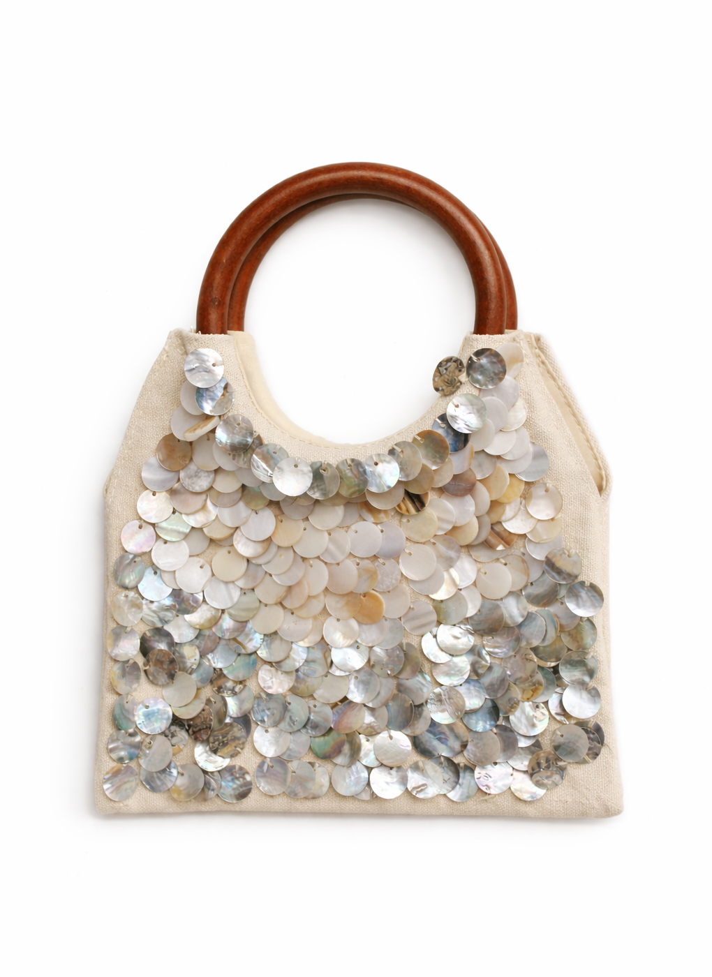REF: 351359 – Bolso clutch o bolso de mano confeccionado en tejido beige natural, decorado en su parte frontal con aplicaciones de discos de nácar en tonos marfil, beige y reflejos irisados que aportan un brillo sutil y muy elegante. Cada pieza crea un efecto luminoso y especial que convierte este bolso en el centro de cualquier look.