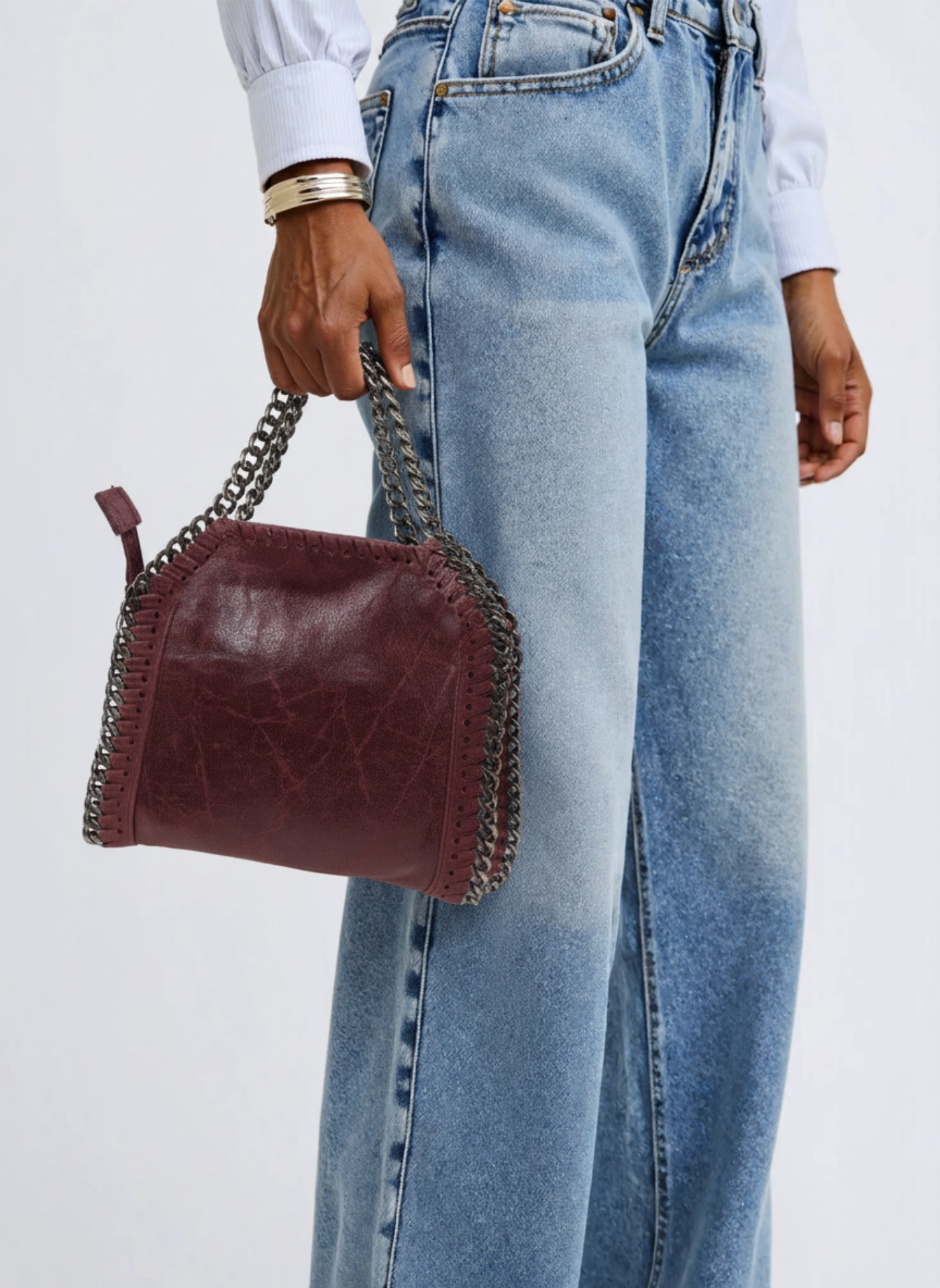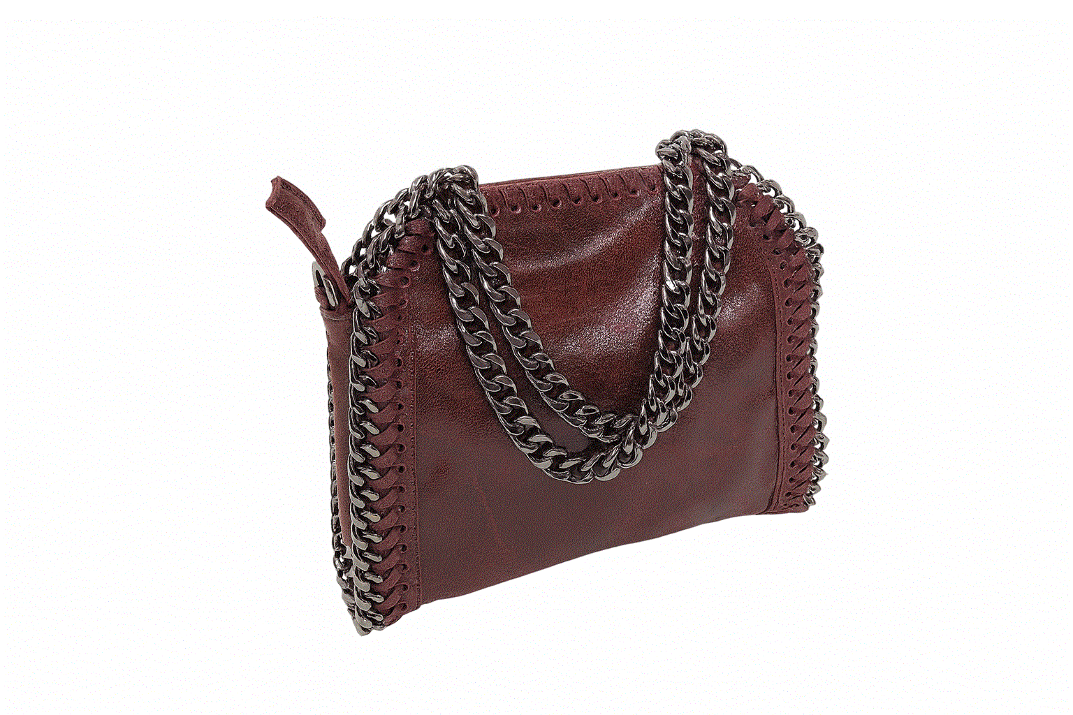 REF: 21409 – Bolso de mano o bolso bandolera, diseño muy elegante y sofisticado, confeccionado en piel de alta calidad con acabado en tono burdeos de efecto desgastado que aporta un estilo moderno y atemporal. Destaca por su diseño estructurado con detalle de cadenas metálicas gruesas en color gris plomo, que funcionan como asas dobles y a la vez brindan un look vanguardista y llamativo. Sus costuras decorativas en los bordes realzan la silueta del bolso, mientras que su interior amplio y seguro con cierre de cremallera permite llevar lo esencial con comodidad.