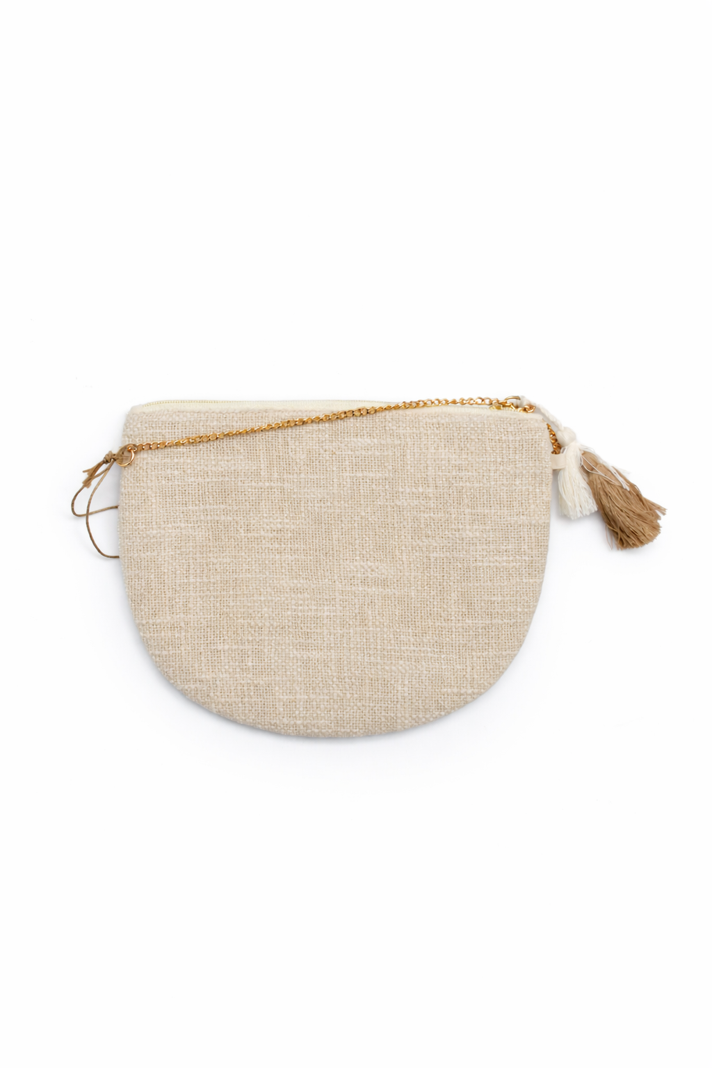 Cuenta con cierre de cremallera superior y detalle de borlas decorativas en blanco y negro que añaden un toque especial. Incluye cadena fina para llevar al hombro o cruzado, adaptándose a diferentes estilos y ocasiones.
