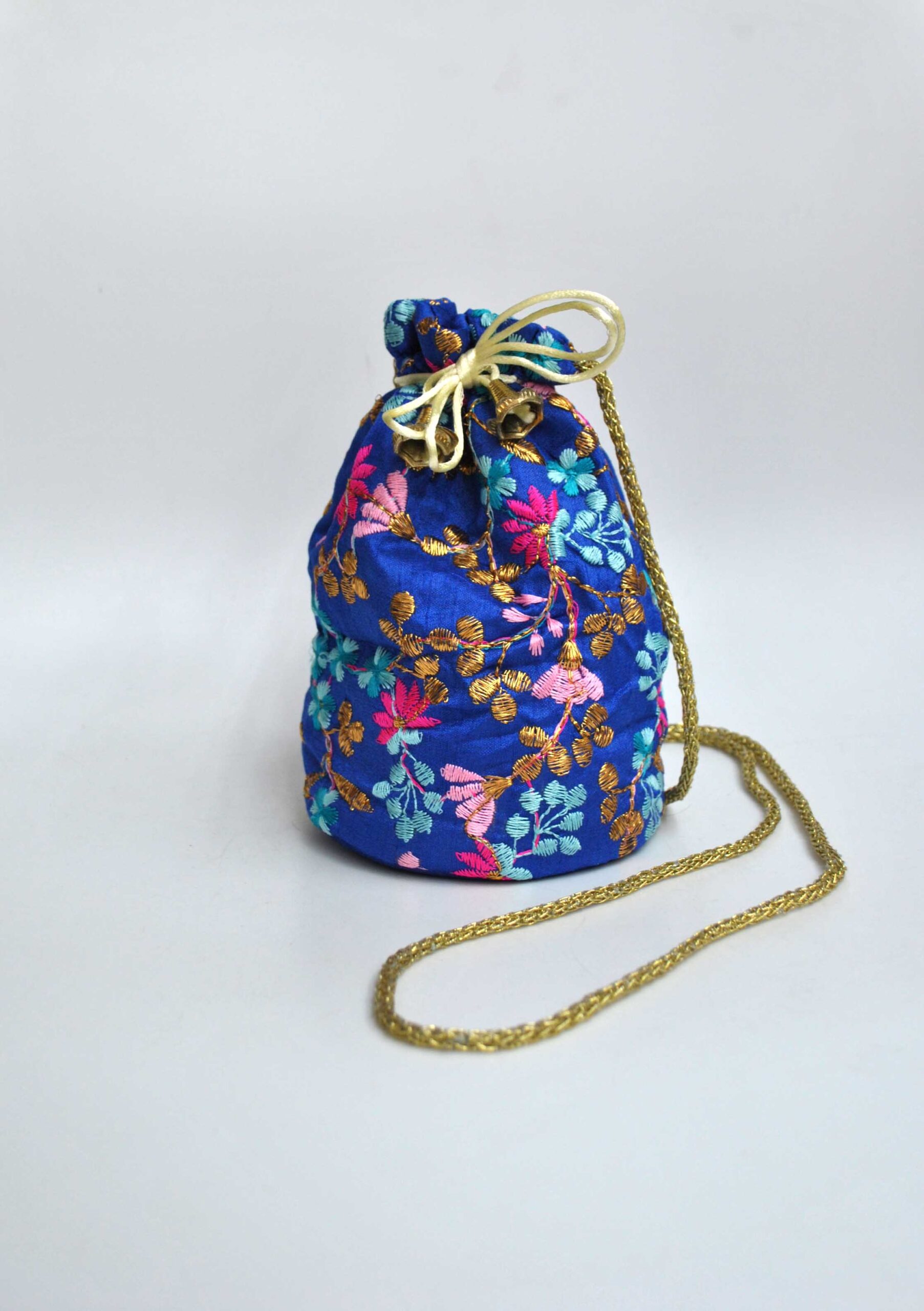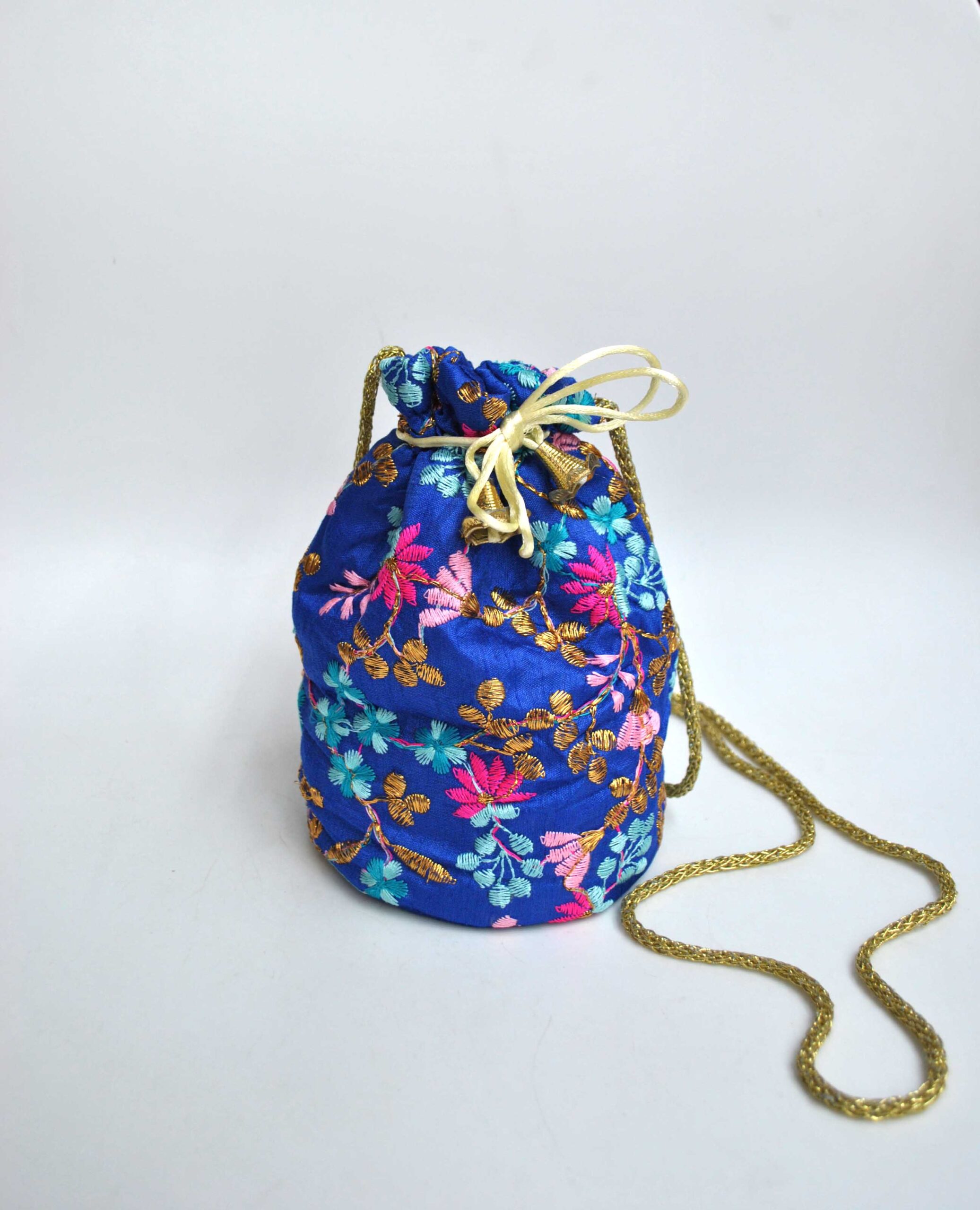 R03/5439 – Bonito y original bolso de fiesta clutch o bolso bombonera color azul. Se trata de un bolsito con correa dorada de cordón confeccionado en tela roja y con flores bordadas combinadas en diferentes tonos.