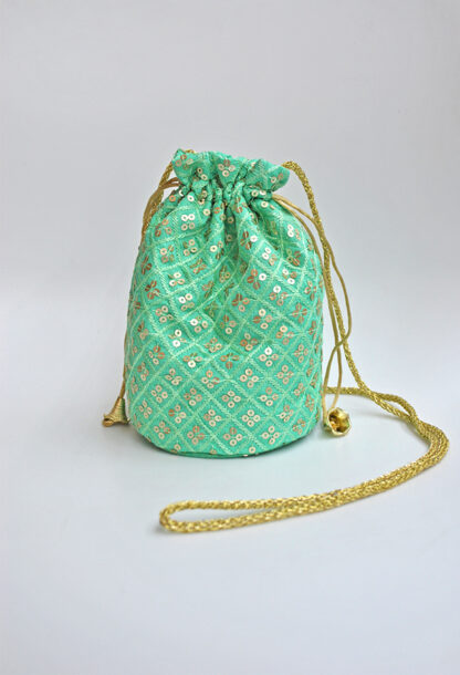 R03/5219 – Bonito bolso clutch o bolso bombonera de fiesta. Se trata de una bombonera confeccionada en tela de color verde agua y, decorada artesanalmente con lentejuelas plateadas. Además, presenta la cadena de cordón dorado para llevarlo más cómodamente colgado.