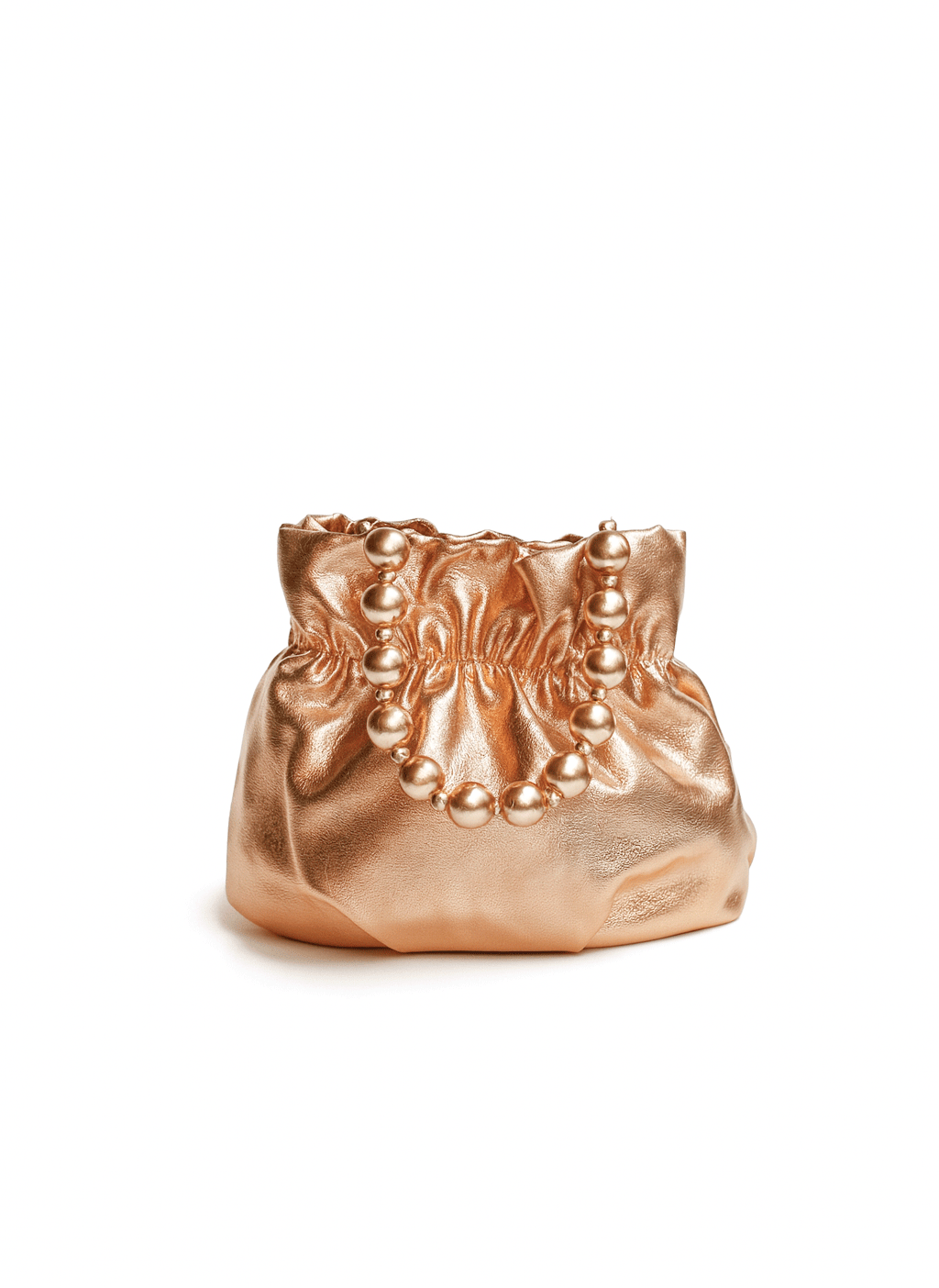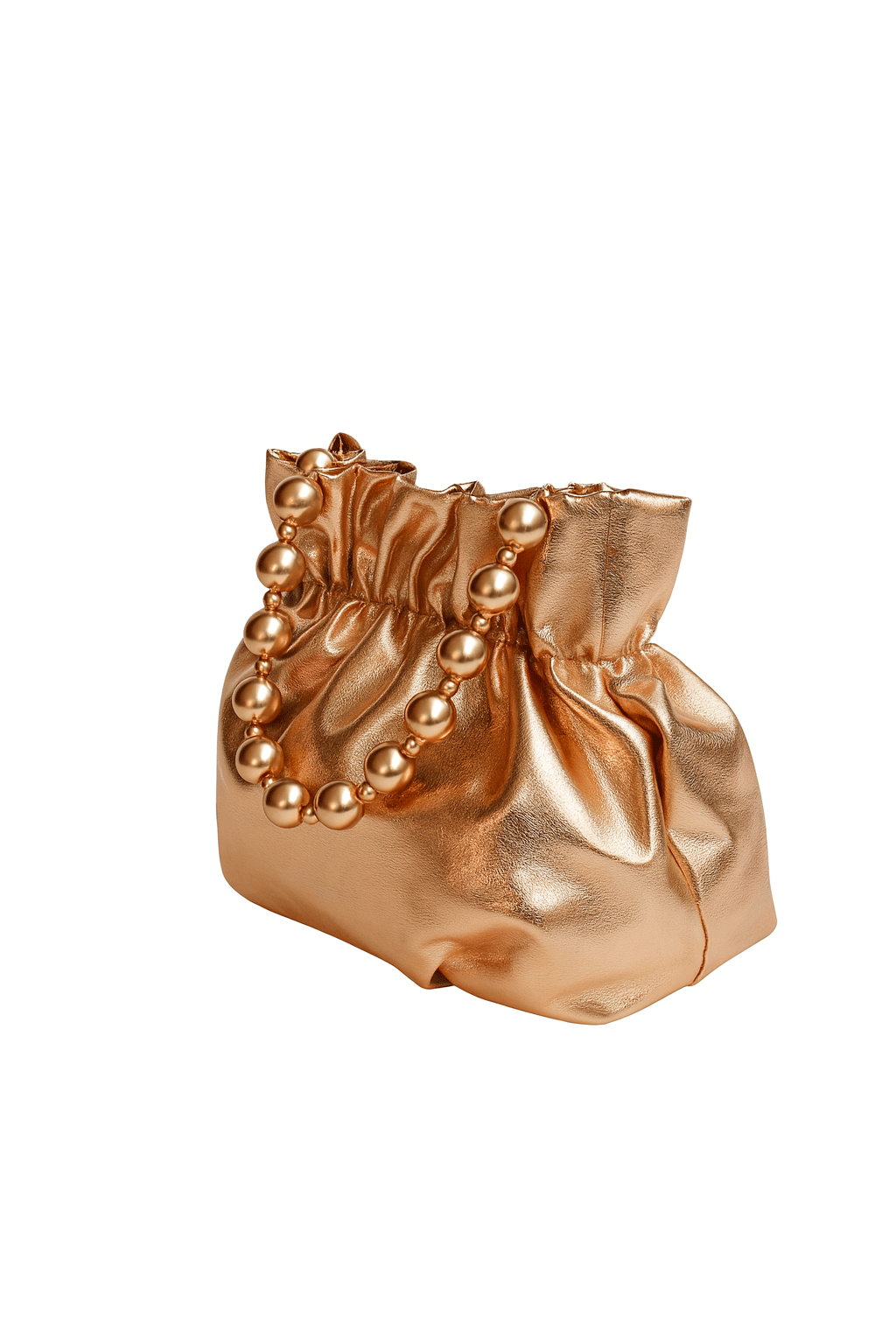 REF: 20290 – Bonito bolso de fiesta clutch o bombonera en color oro rosa. Se trata de un bolso diseñado en forma de saquito, realizado en polipiel oro rosa y, con un original asa de bolas de resina facetadas . Además, en el interior se incluye una cadena larga dorada para llevarlo colgado al hombro.