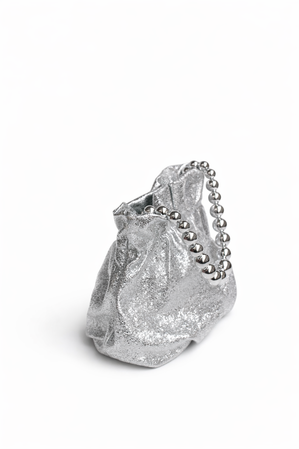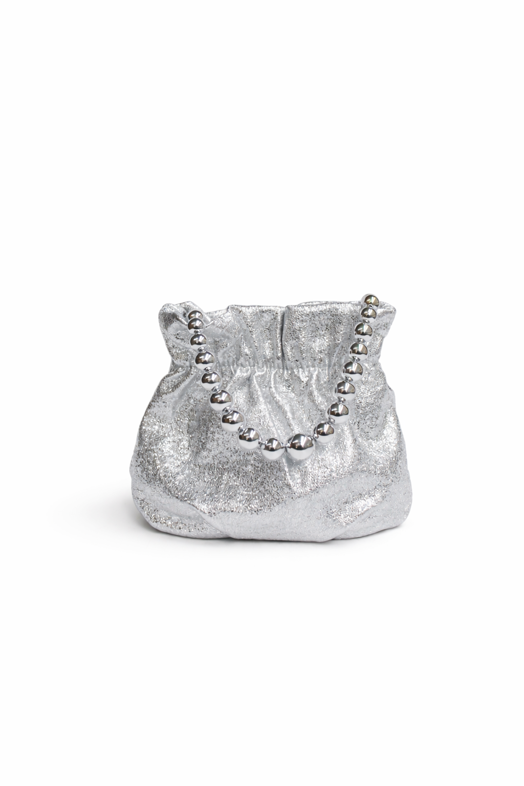 REF: 20290 – Bonito bolso de fiesta clutch o bombonera en color plateado. Se trata de un bolso diseñado en forma de saquito, realizado en polipiel plateado y, con un original asa de bolas de resina esmaltada también en color plateado. Además, en el interior se incluye una cadena larga plateada para llevarlo colgado al hombro.