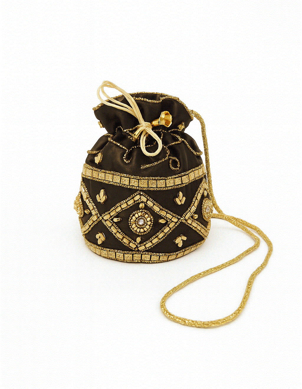 REF: 03/4993 – Bonito bolso clutch o bolso bombonera de fiesta. Se trata de una bombonera confeccionada en tela satinada en tono marrón chocolate y decorada con cuentas doradas. Además, presenta la cadena de cordón dorado para llevarlo más cómodamente colgado.
