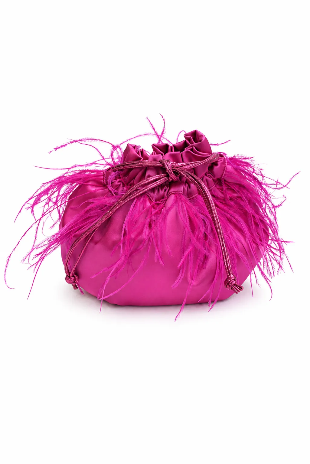 REF: KC-812001  – Precioso bolso de fiesta, bolso clutch bombonera. Se trata de un bolso diseñado en forma de saco y forrado en tela de raso o satén en color fucsia. Además consta de pequeñas, elegantes y vaporosas plumas del mismo color.