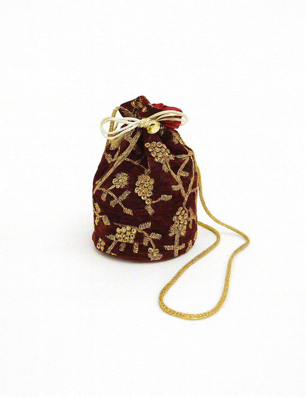 R03/5439 – Bonito y original bolso de fiesta clutch o bolso bombonera color burdeos. Se trata de un bolsito con correa dorada de cordón confeccionado en tela de terciopelo y bordada a mano con flores e hilos dorados.