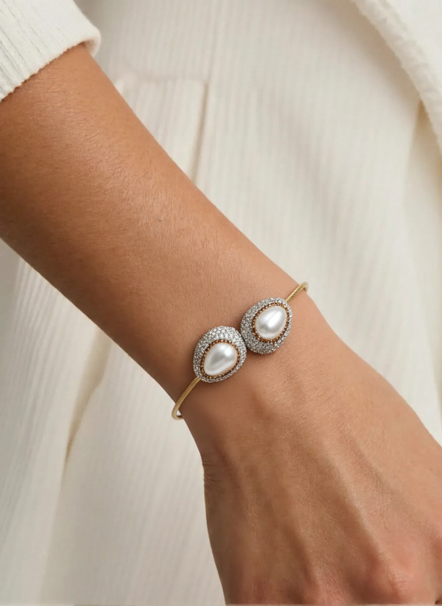 VV092475805 – Bonita pulsera o brazalete fabricada en acero inoxidable dorado inspirada en los modelos de Anton Heunis. Destacan dos perlas diseñadas en forma de gotas y decoradas con elegantes circonitas blancas.
