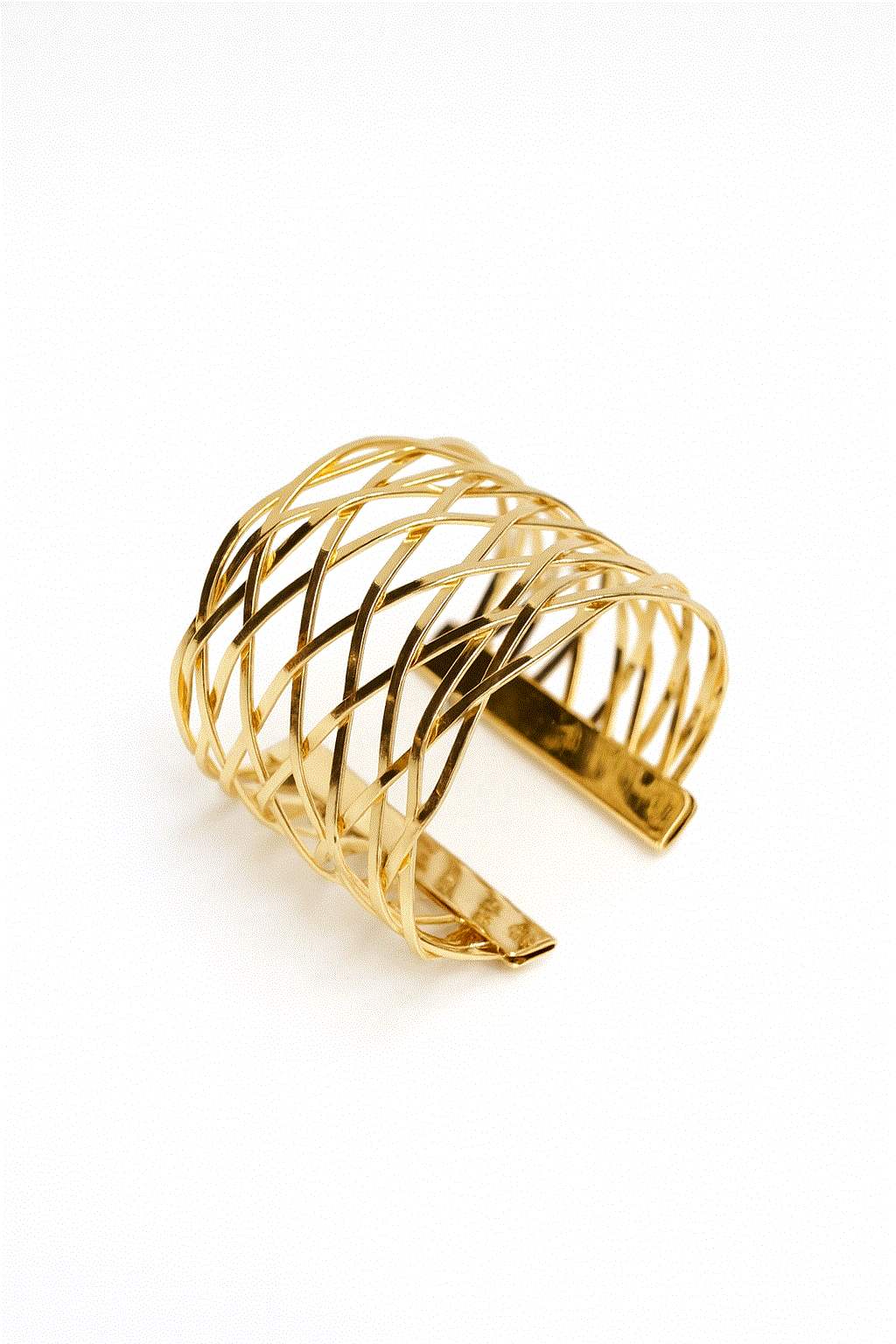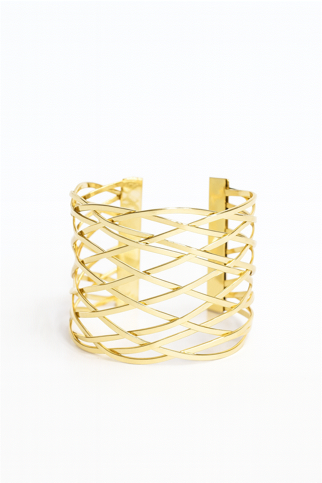 REF: 5810 – Precioso brazalete dorado. Se trata de una pulsera brazalete fabricada en metal ligero dorado, ancho y con diseño trenzado, accesorio súper tendencia esta temporada.