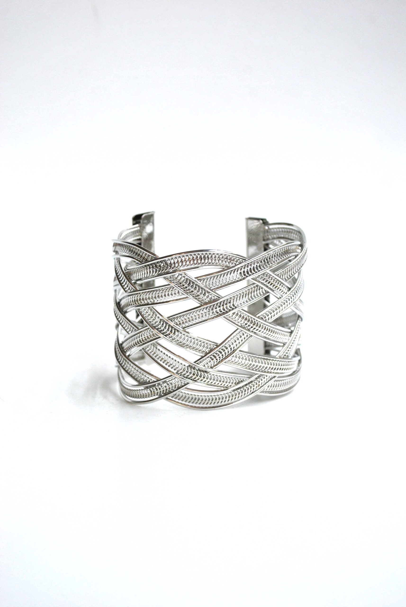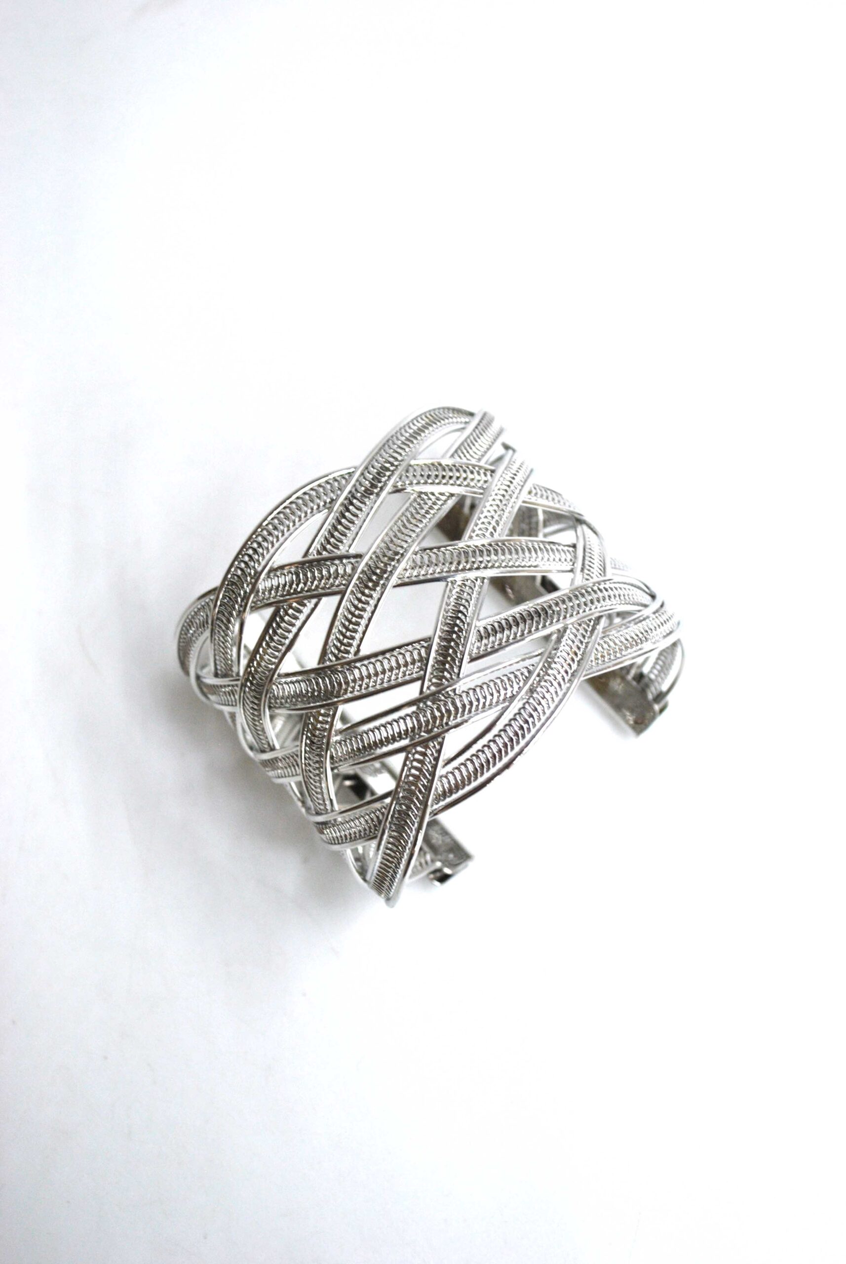 REF: 5810 – Brazalete plateado de metal diseño trenzado. Un accesorio súper llamativo y elegante. Tiene un diseño entrelazado que lo hace ver único y con mucho detalle. Ideal para darle un toque chic a cualquier outfit, ya sea casual o formal.