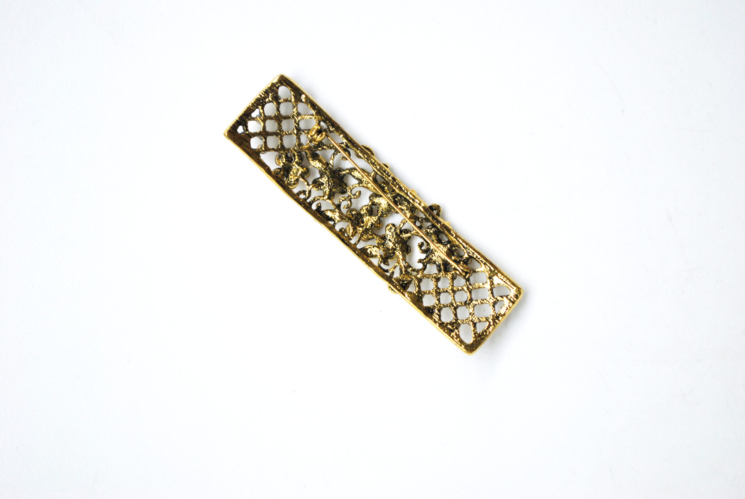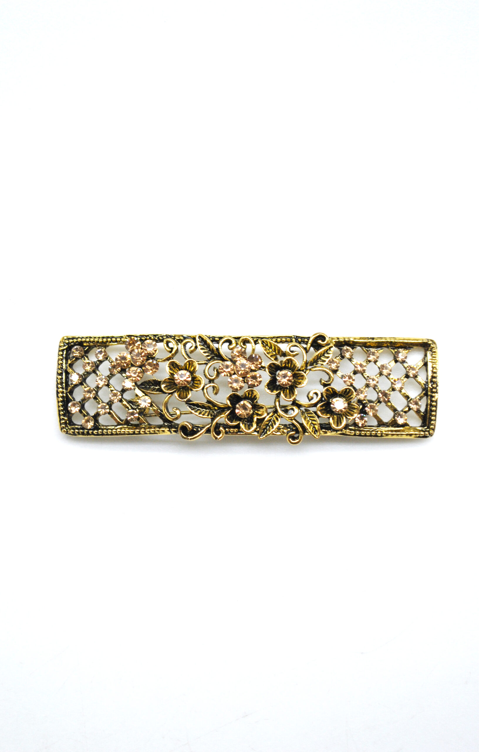 REF: 3619 – Precioso broche ideal para colocarlo en mantillas de madrinas e invitadas de ceremonia. Se trata de un broche fabricado en metal ligero dorado envejecido, diseñado en una original y atractiva forma vintage y, decorado con pequeños y elegantes circonitas o pequeños cristales dorados envejecidos.