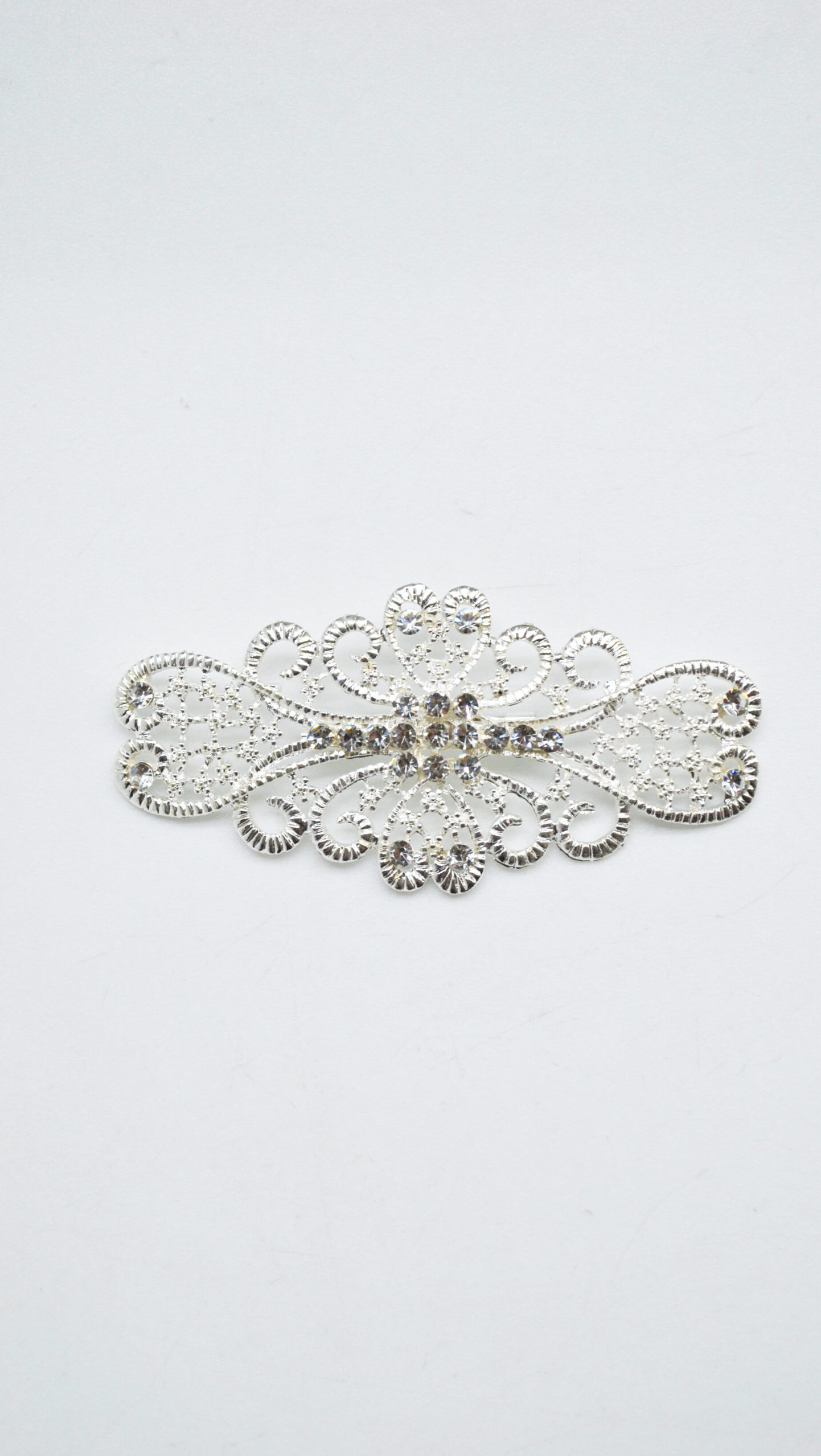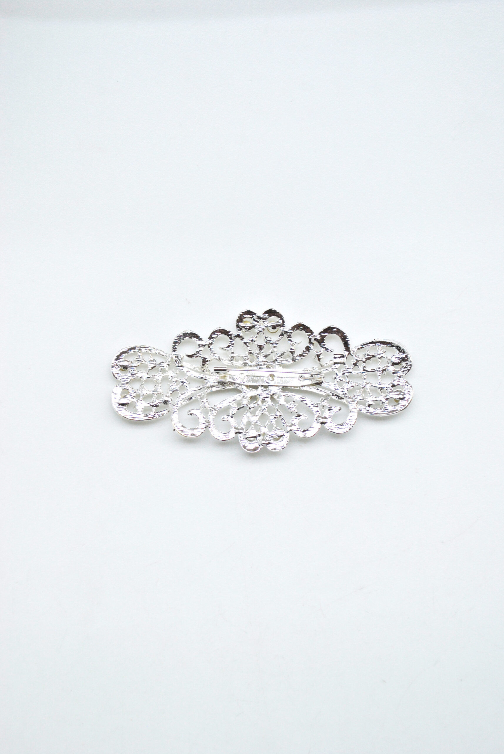 REF: 3619 – Precioso broche ideal para colocarlo en mantillas de madrinas e invitadas de ceremonia. Se trata de un broche fabricado en metal ligero plateado, diseñado en una original y atractiva forma vintage y, decorado con pequeños y elegantes circonitas o pequeños cristales blancos.