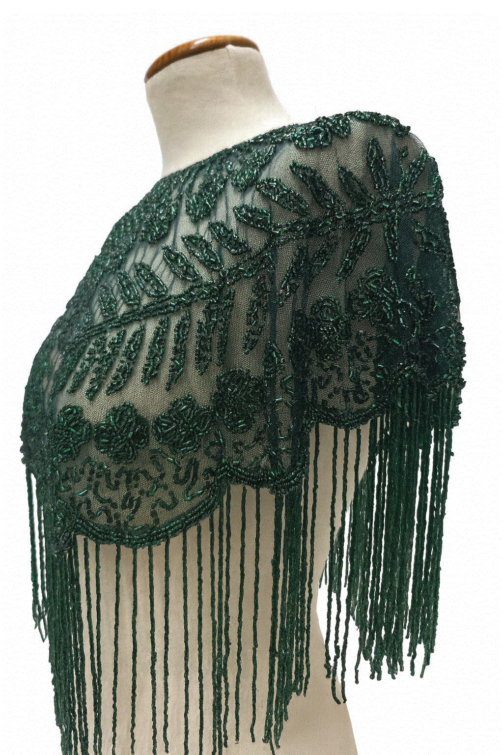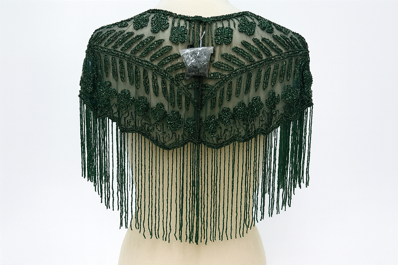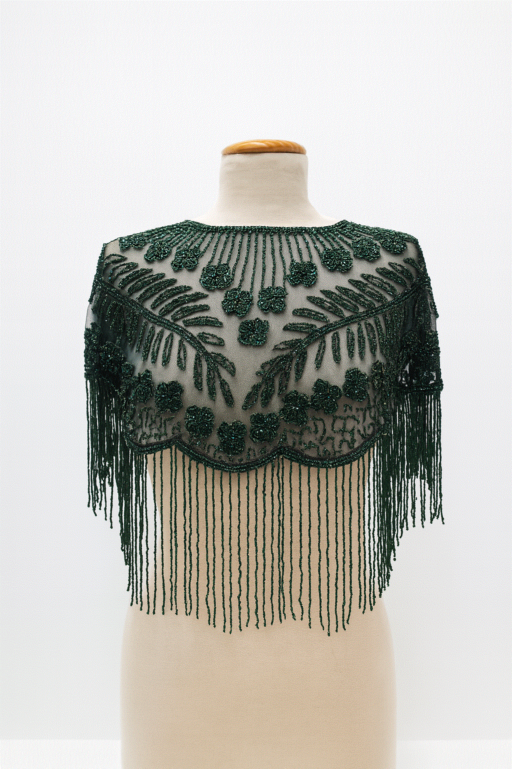 BI52526014 – Preciosa capa joya de fiesta. Se trata de una capa de piedras realizada manualmente con flecos de rocalla verde botella y un espectacular bordado de rocallas a juego. El complemento perfecto en tus looks de fiesta. Ideal para todo tipo de eventos, cenas especiales o ceremonias como bodas de noche. Cierre de corchete muy sencillo de poner y utilizar.