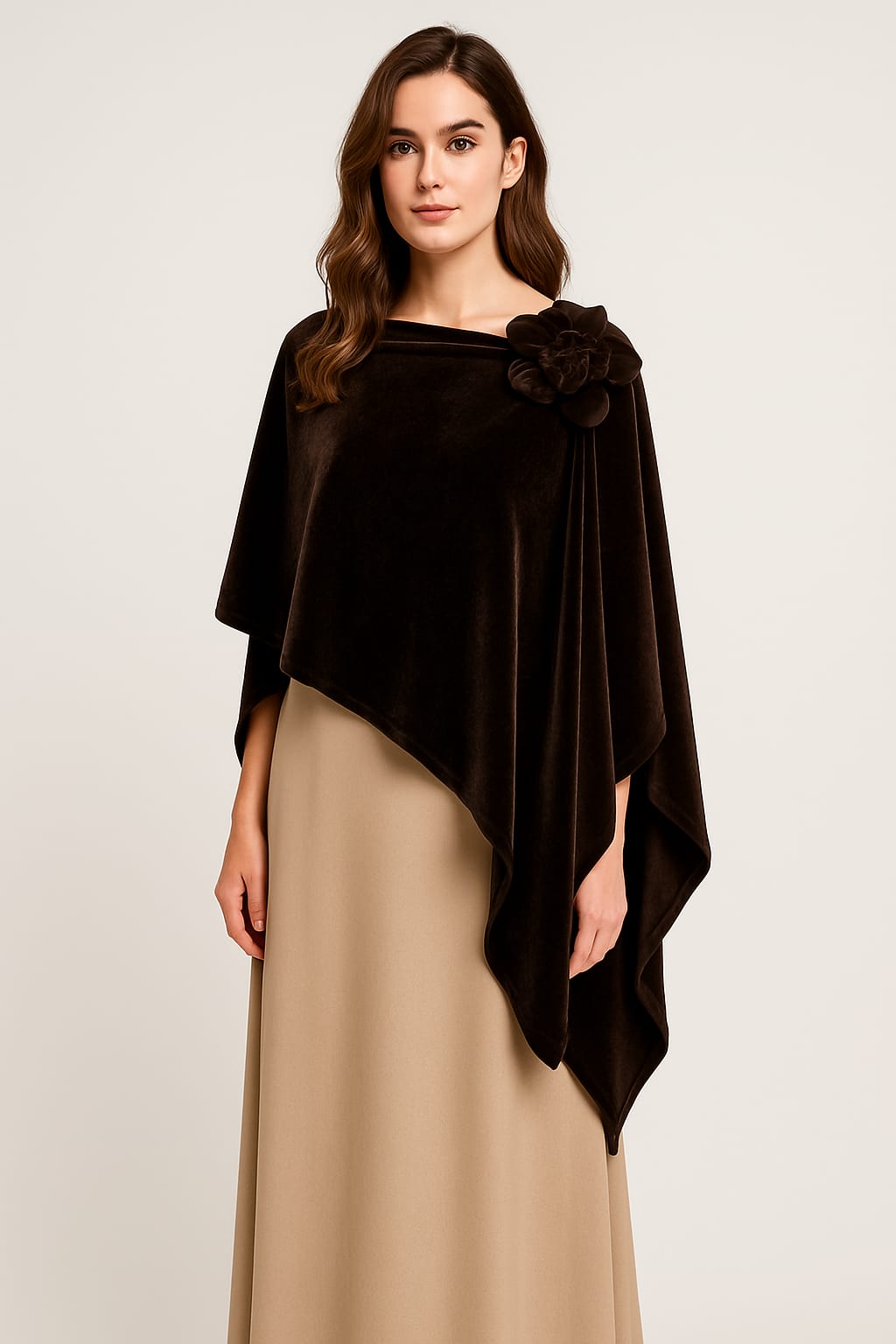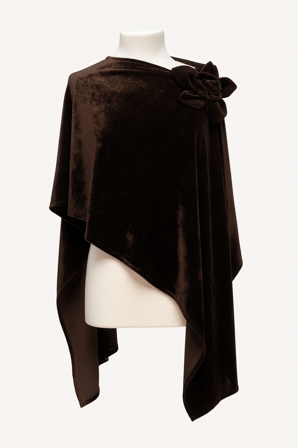 REF: 93357 – Elegante capa de fiesta en color marrón chocolate confeccionada en tela de terciopelo con el detalle de un broche de una flor en el mismo tejido (se puede quitar), una prenda que combina lujo y comodidad en una sola pieza. Confeccionada con terciopelo de alta calidad, esta capa es perfecta para quienes buscan destacar con un toque de sofisticación.