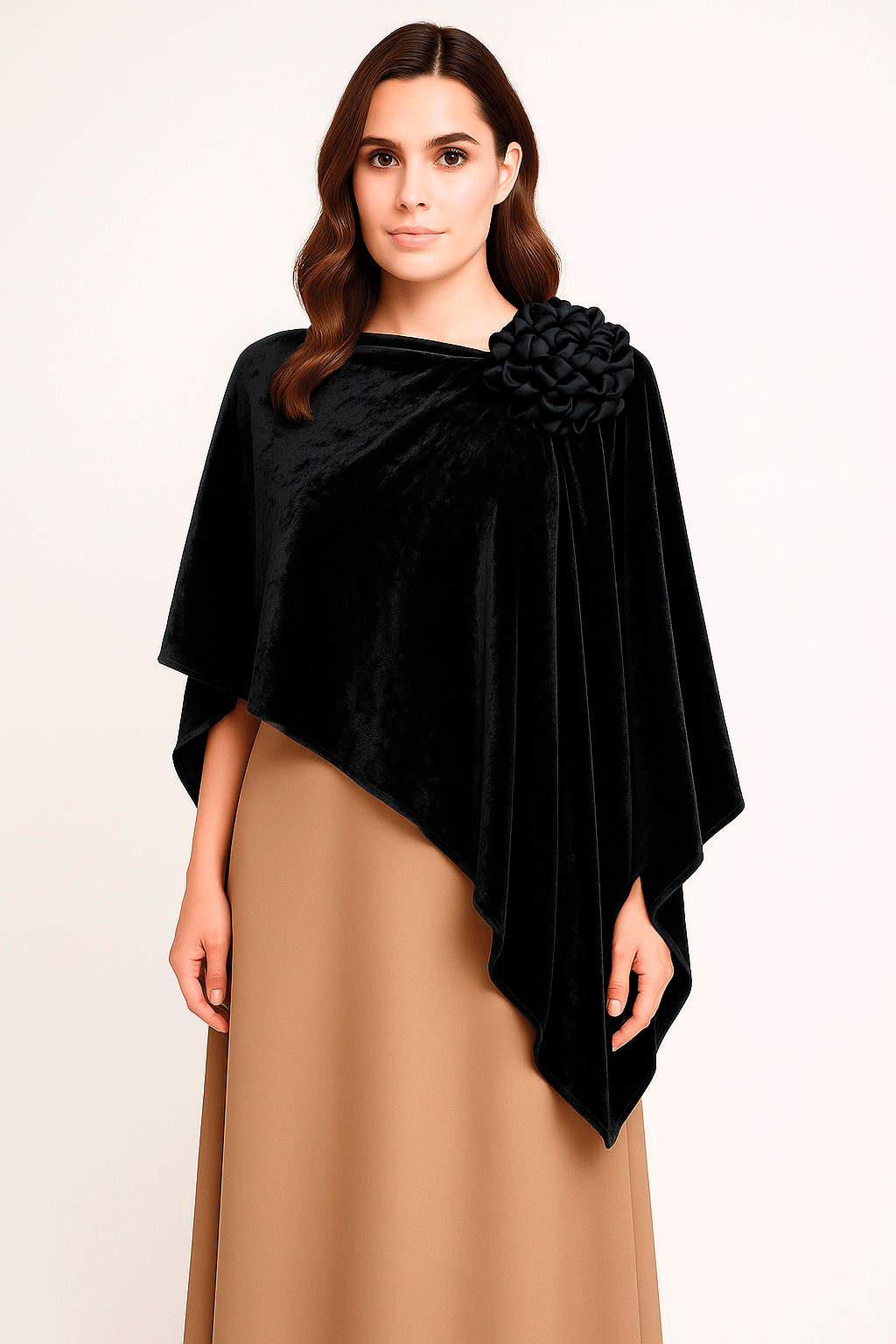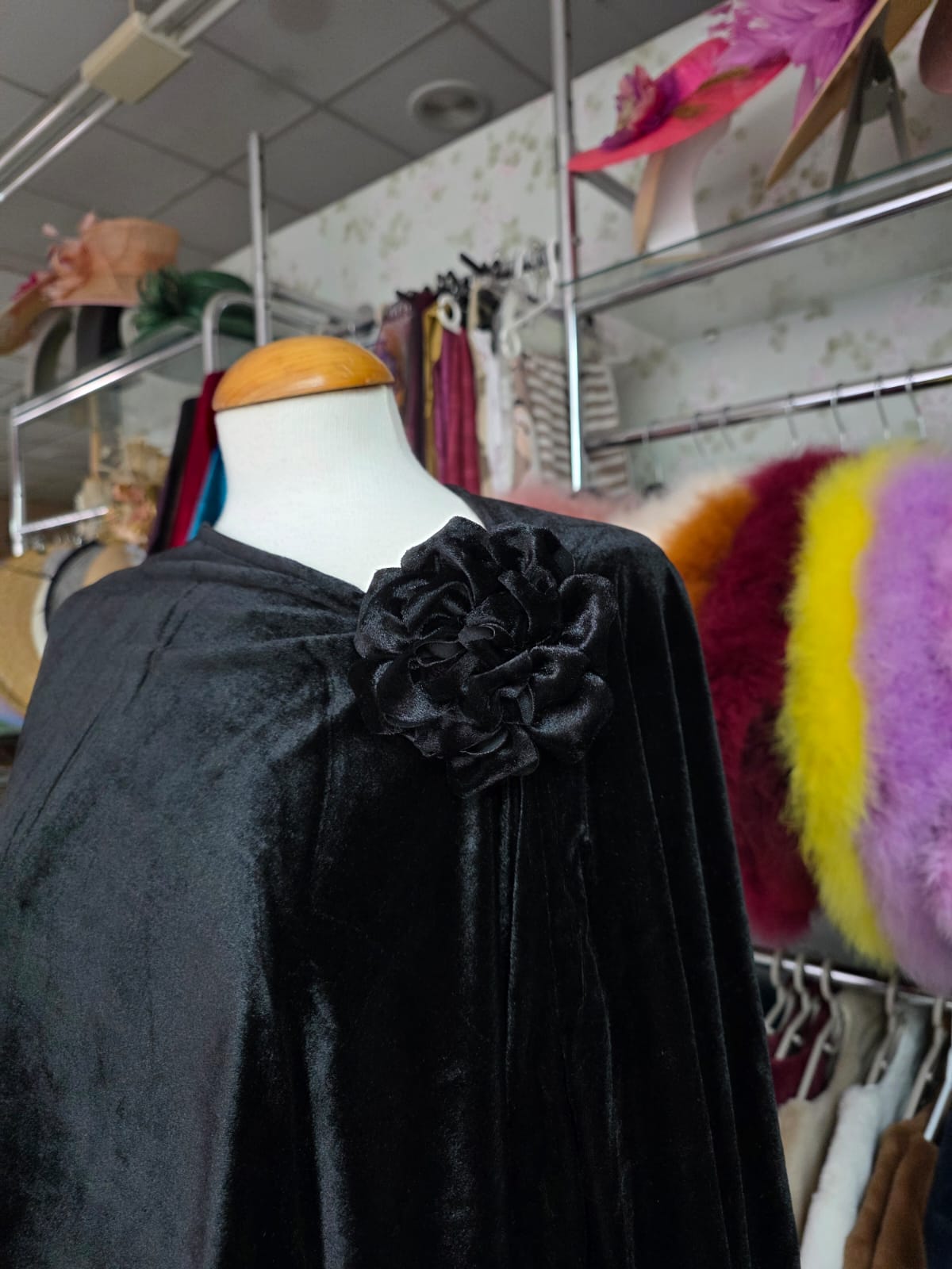 REF: 93357 – Elegante capa negra de fiesta realizada en tela de terciopelo con el detalle de un broche de una flor en el mismo color (se puede quitar), una prenda que combina lujo y comodidad en una sola pieza. Confeccionada con terciopelo de alta calidad, esta capa es perfecta para quienes buscan destacar con un toque de sofisticación.