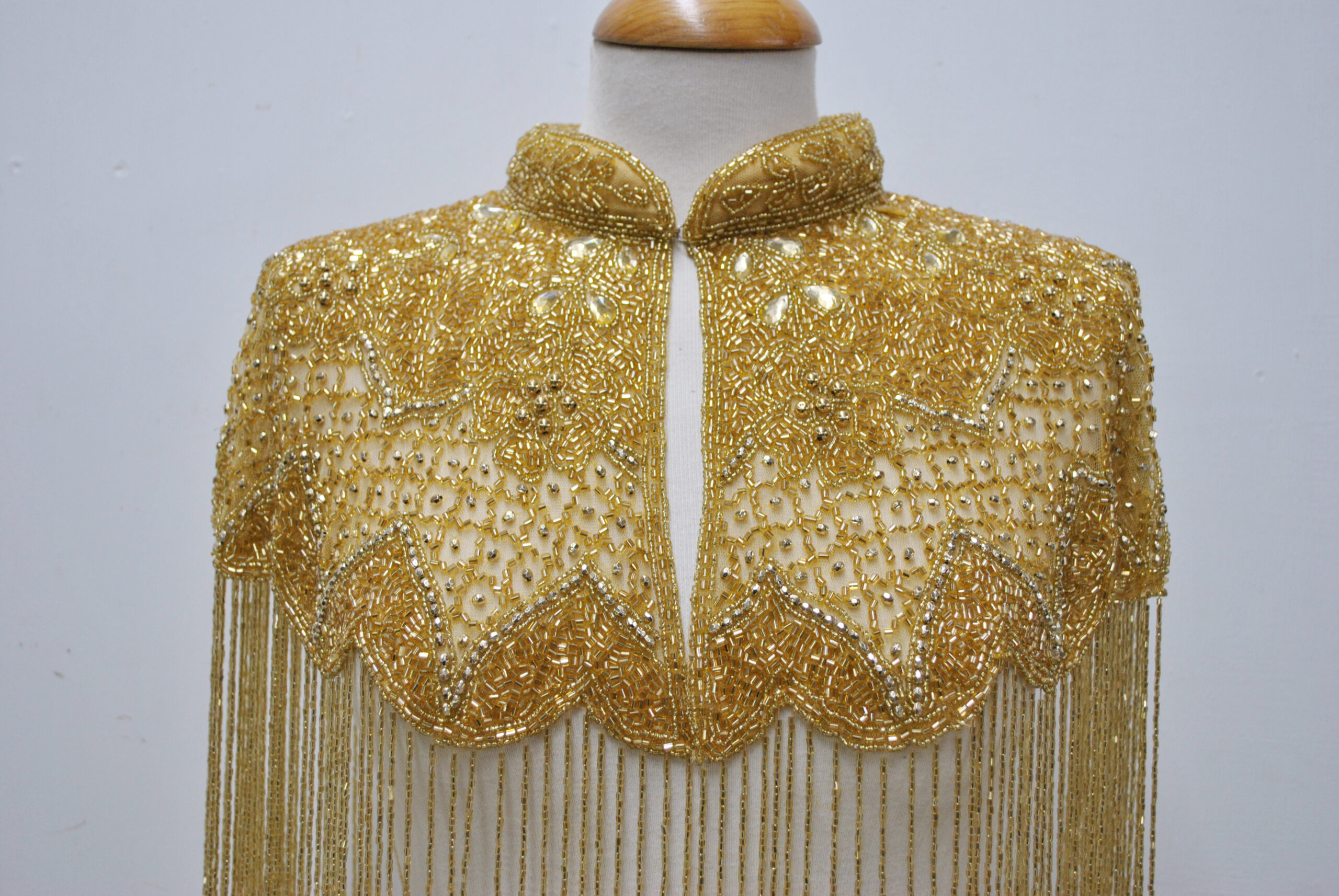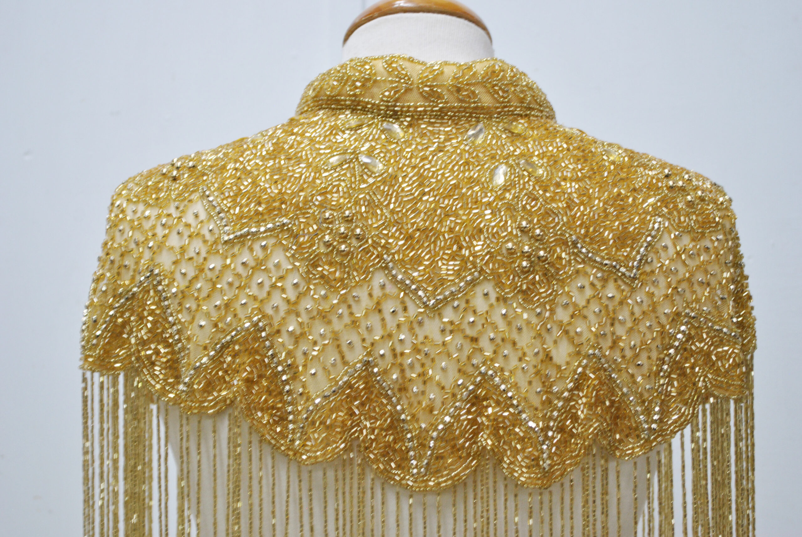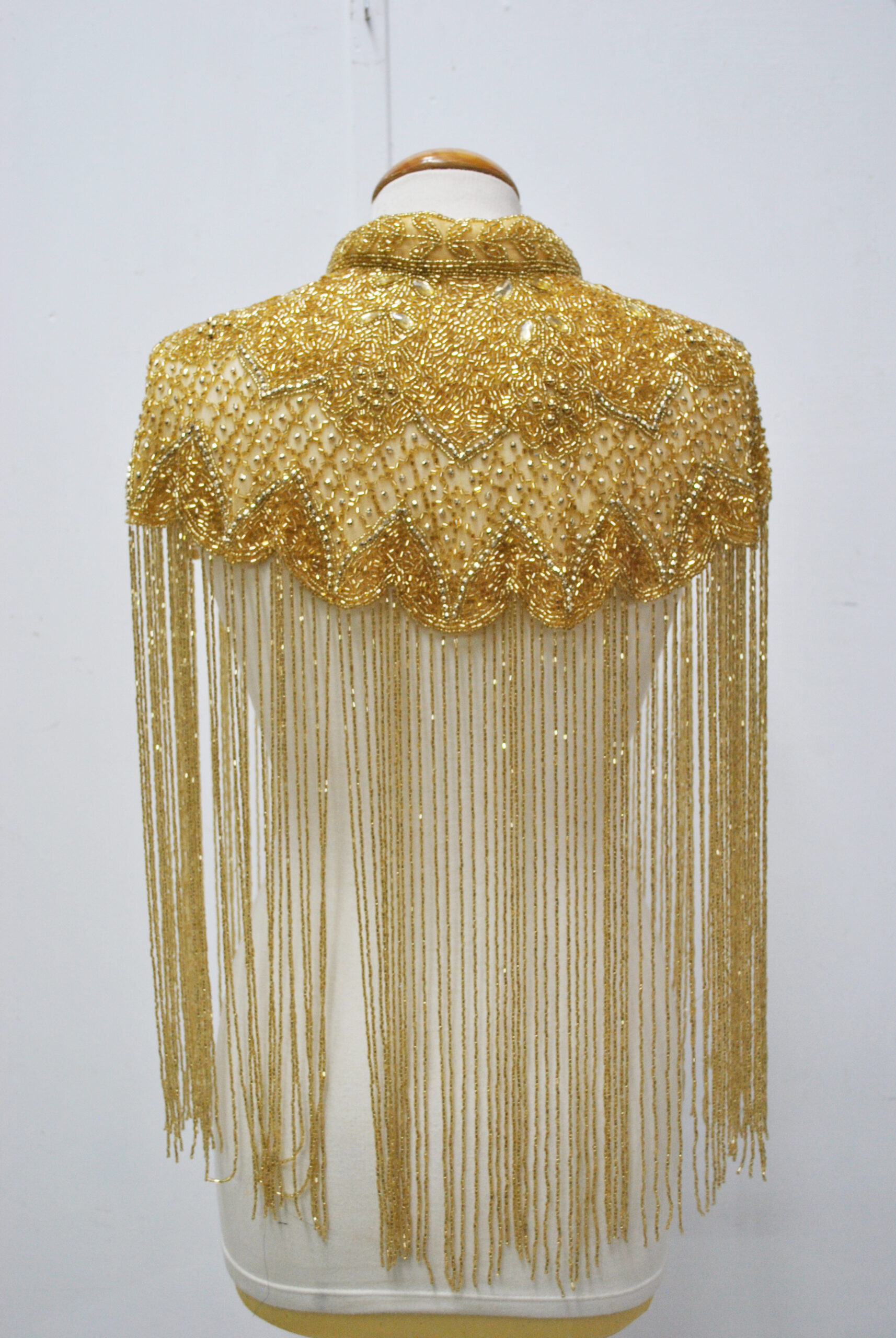 BI52526014 – Preciosa capa joya de fiesta. Se trata de una capa de piedras realizada manualmente con flecos de rocalla dorados y un espectacular bordado de rocallas a juego. El complemento perfecto en tus looks de fiesta. Ideal para todo tipo de eventos, cenas especiales o ceremonias como bodas de noche. Cierre de corchete muy sencillo de poner y utilizar