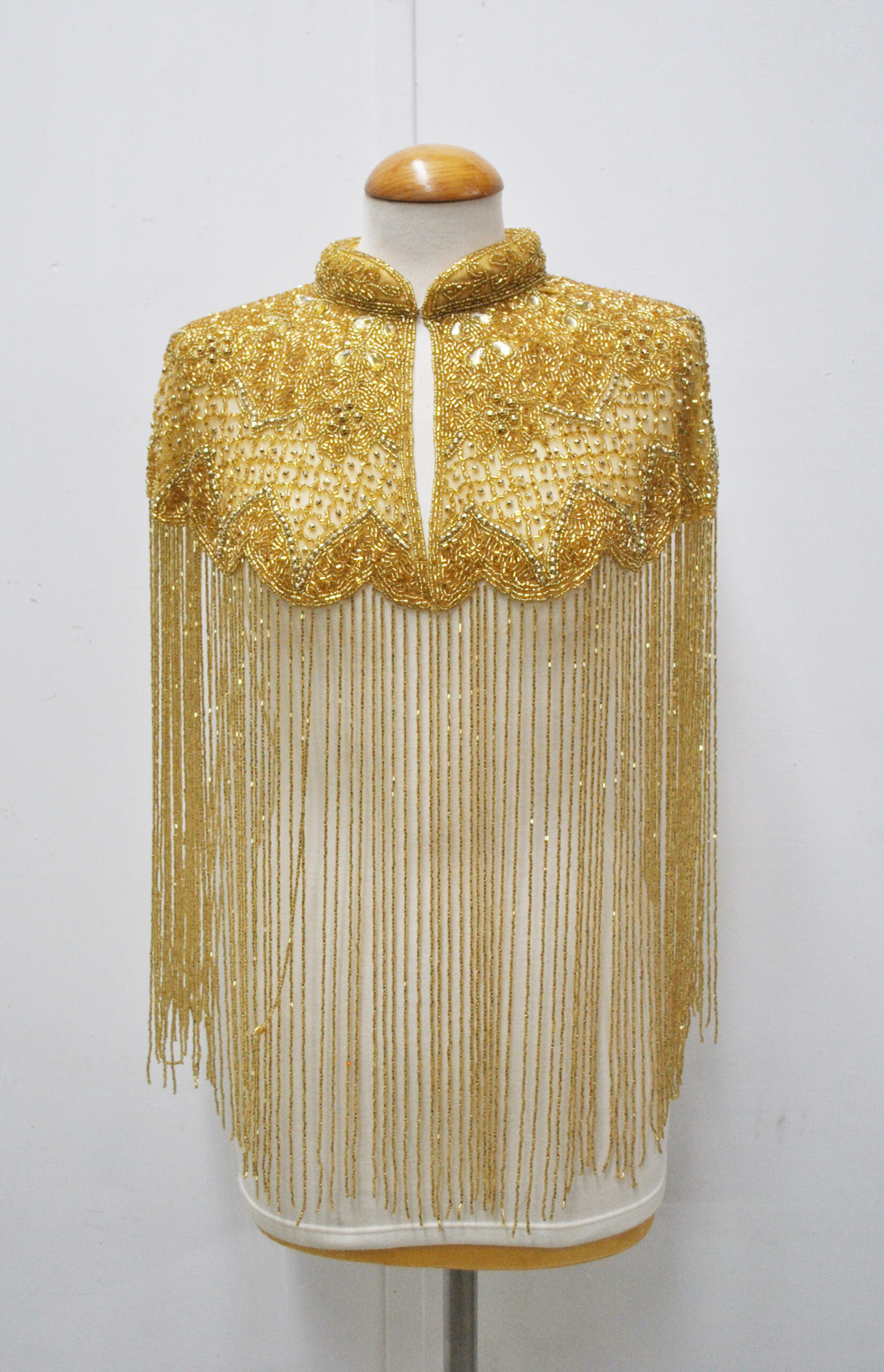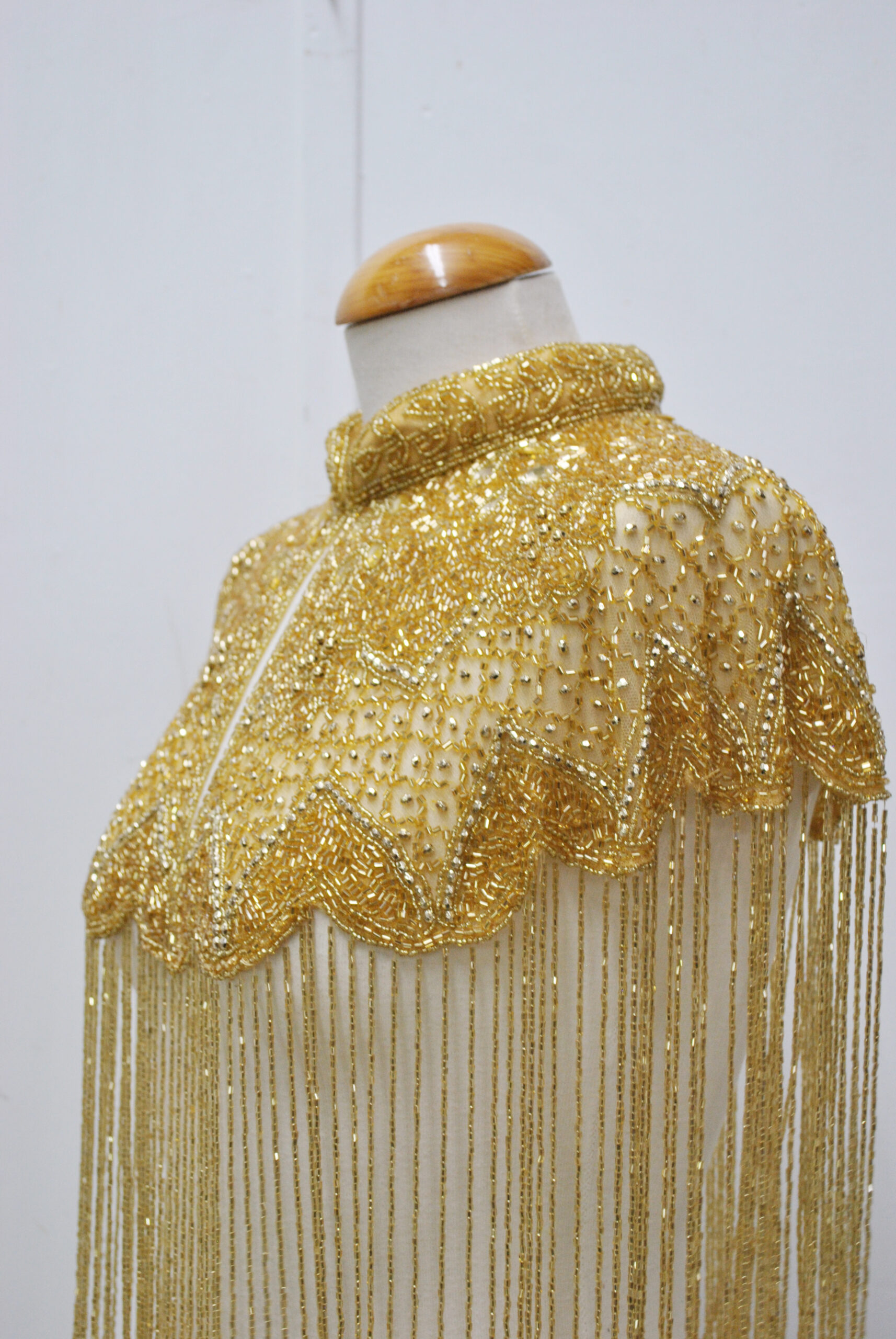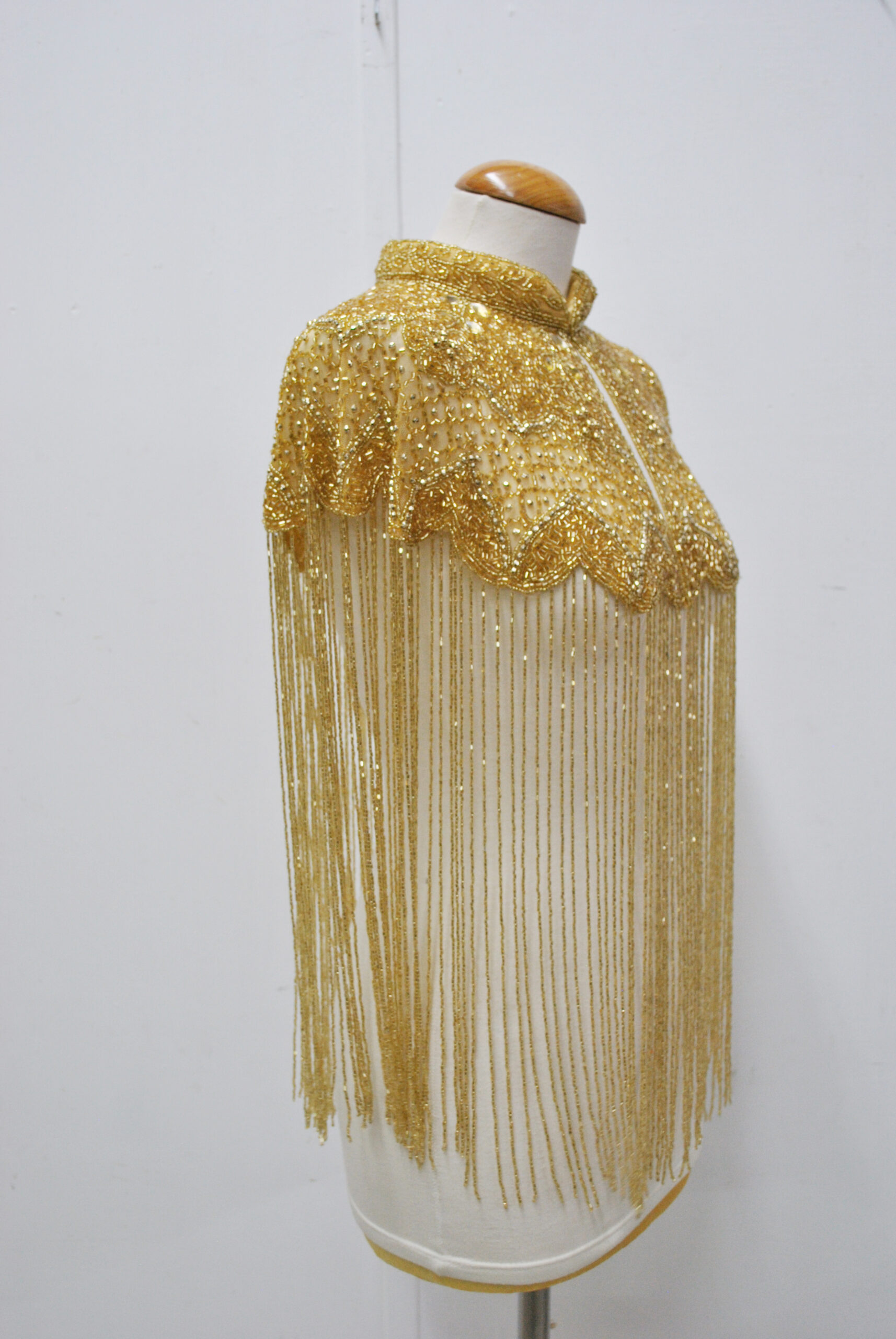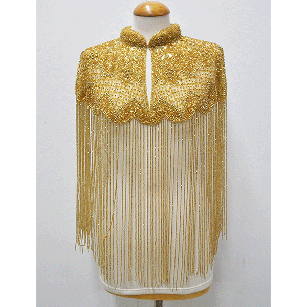 BI52526014 – Preciosa capa joya de fiesta. Se trata de una capa de piedras realizada manualmente con flecos de rocalla dorados y un espectacular bordado de rocallas a juego. El complemento perfecto en tus looks de fiesta. Ideal para todo tipo de eventos, cenas especiales o ceremonias como bodas de noche. Cierre de corchete muy sencillo de poner y utilizar